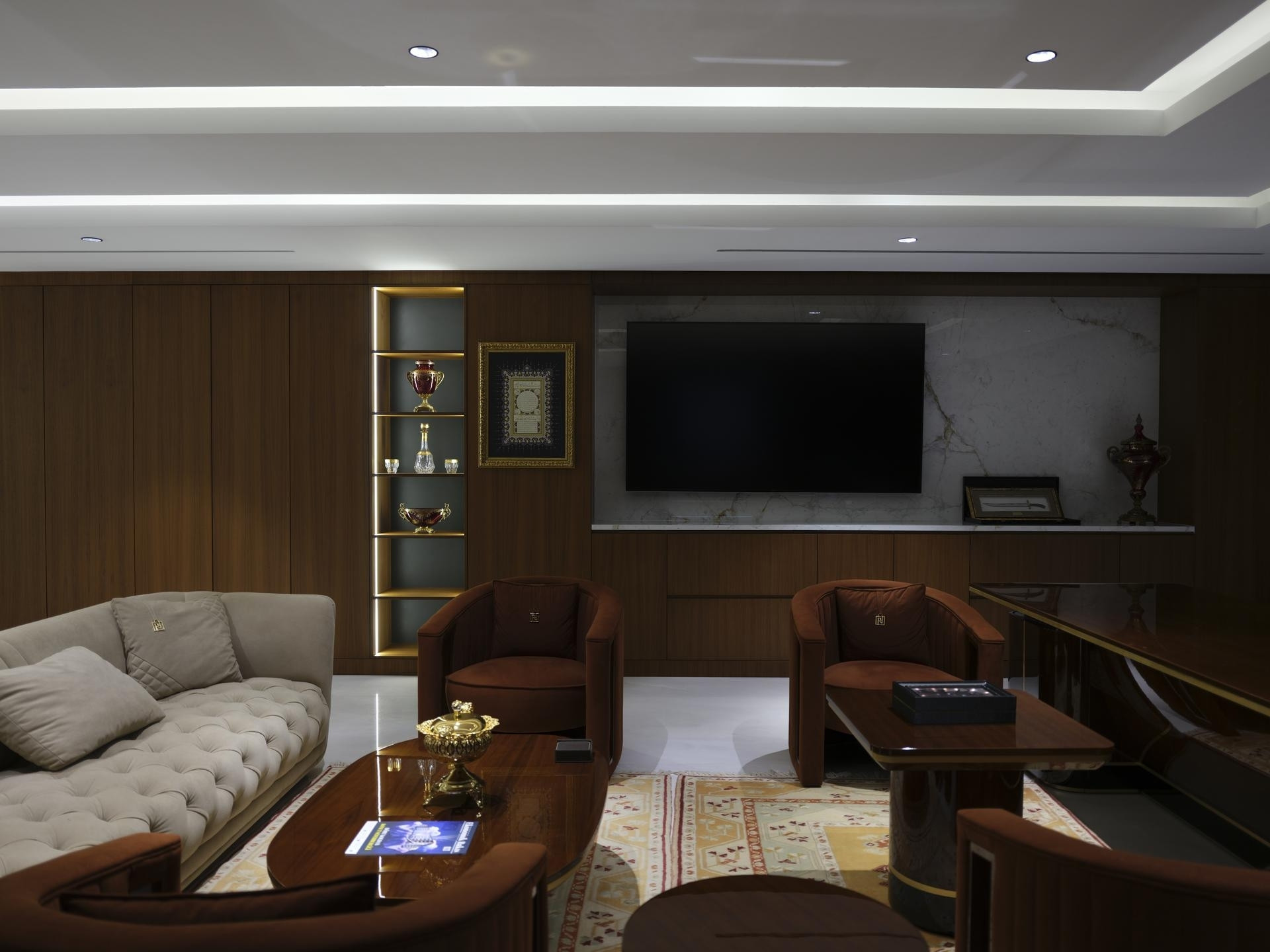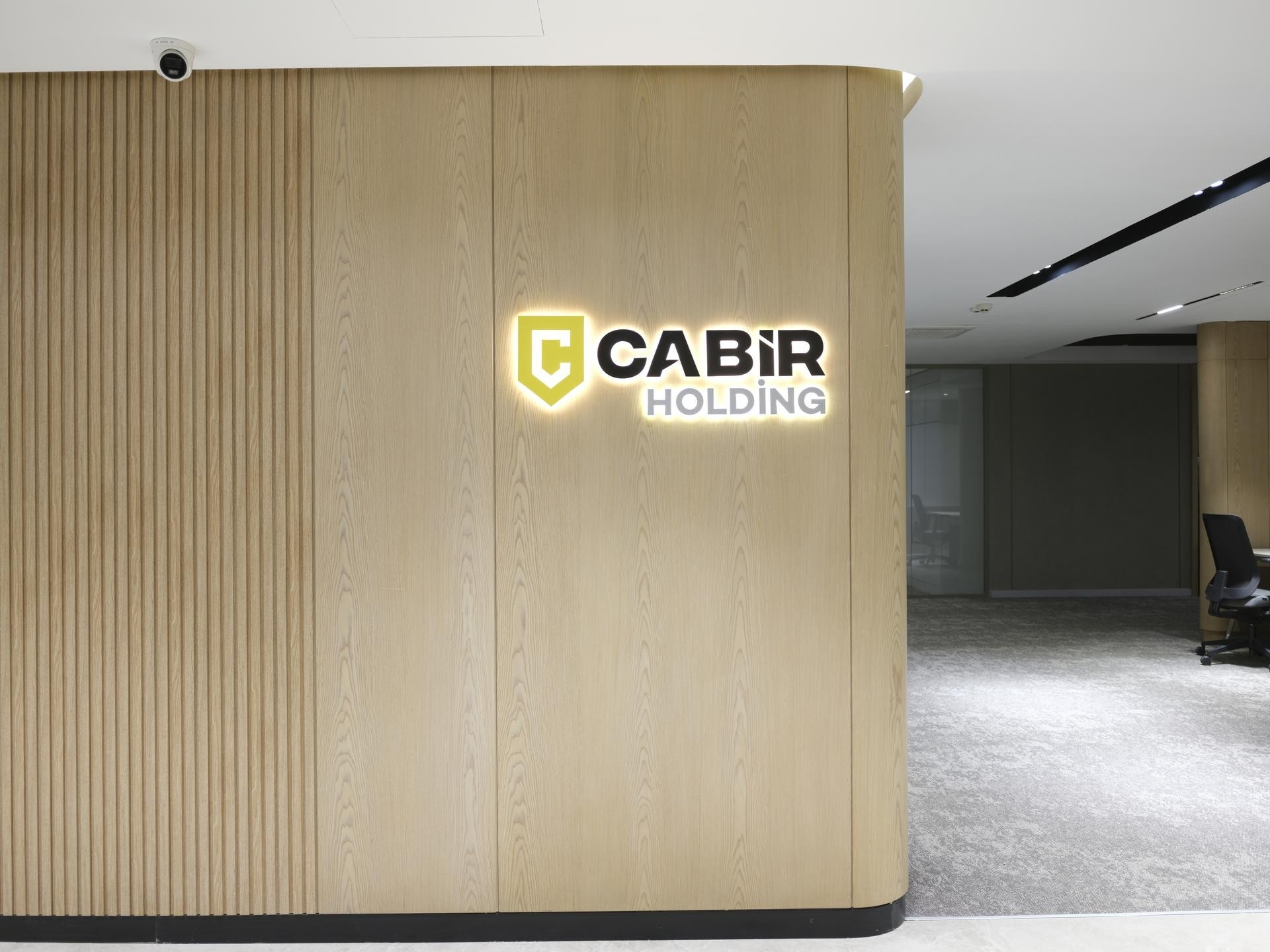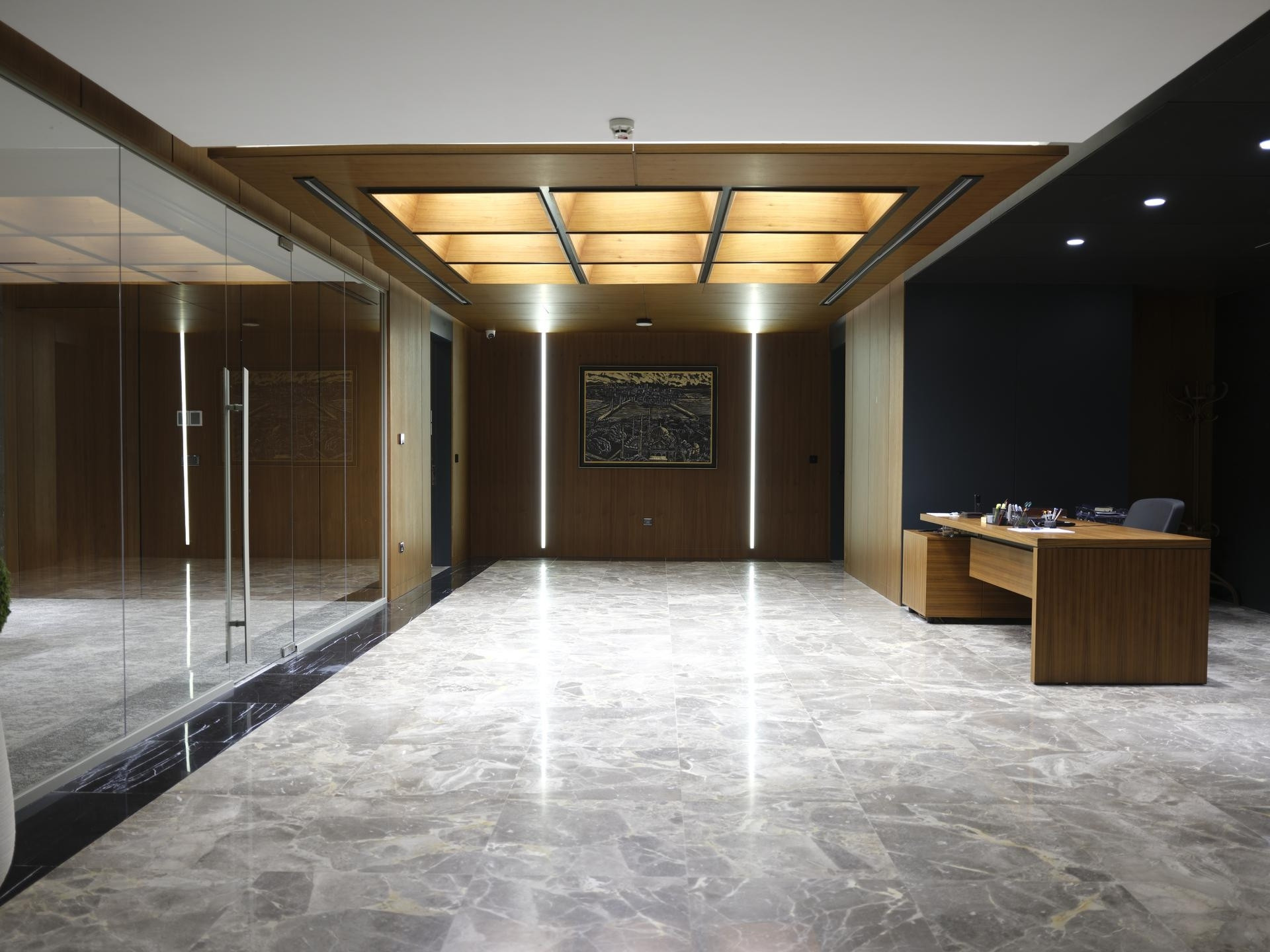 Giriş ve Lobi: Holdingimizin kurumsal prestijini yansıtan; yüksek tavanlı ahşap giydirmeler (lambri) ve mekânın ağırlığını taşıyan özel tasarım duvar panelleri.