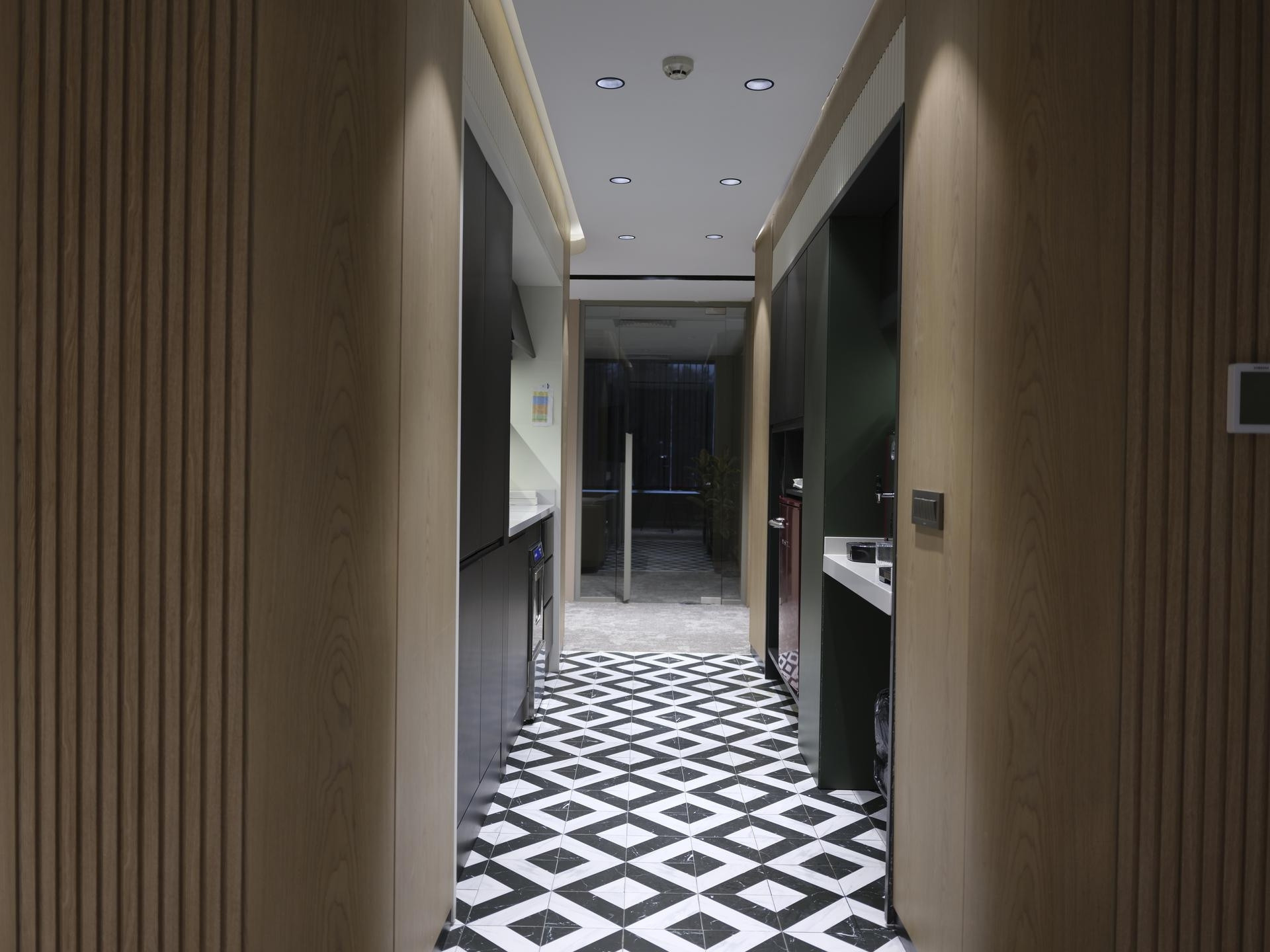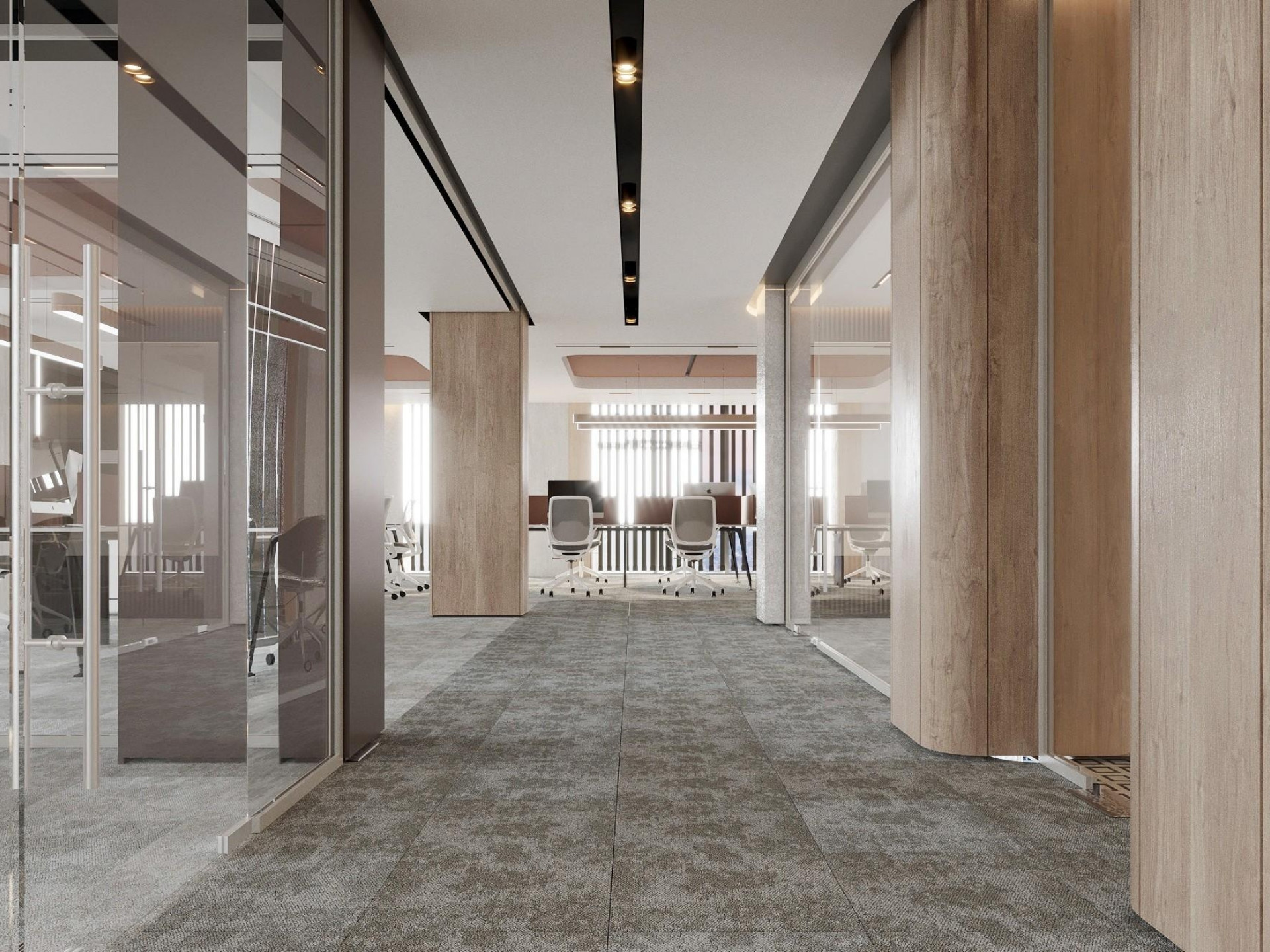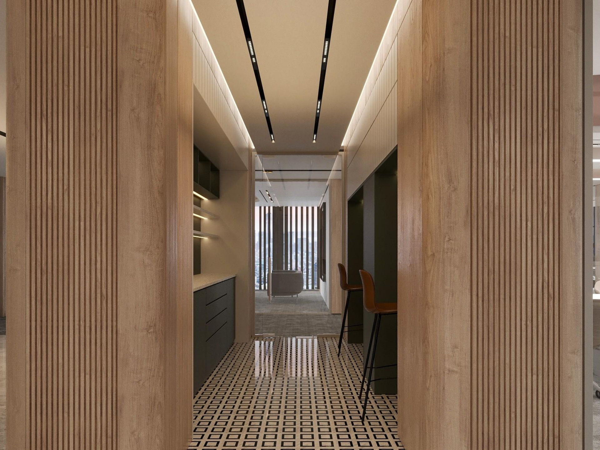 Giriş ve Lobi: Holdingimizin kurumsal prestijini yansıtan; yüksek tavanlı ahşap giydirmeler (lambri) ve mekânın ağırlığını taşıyan özel tasarım duvar panelleri.