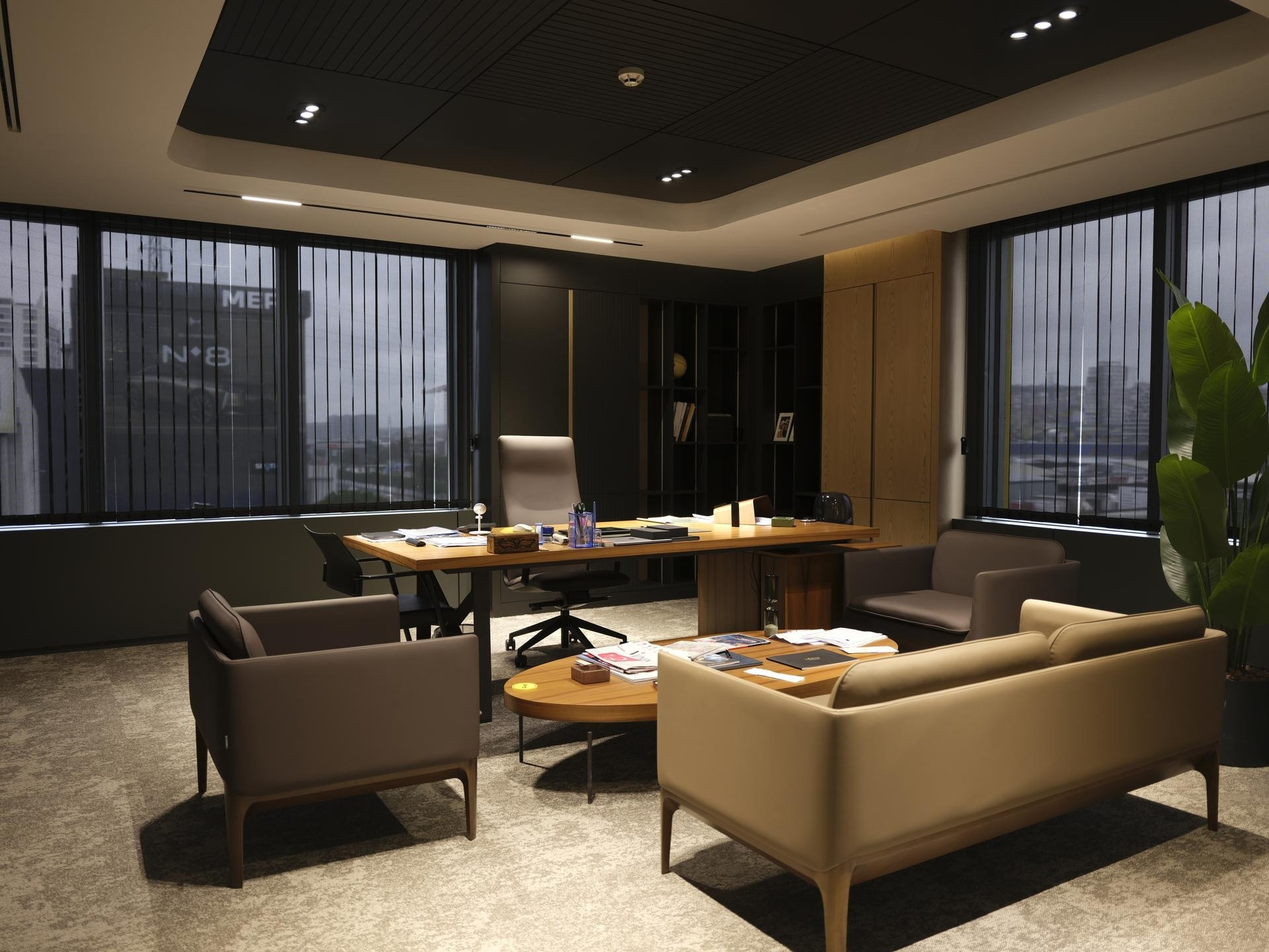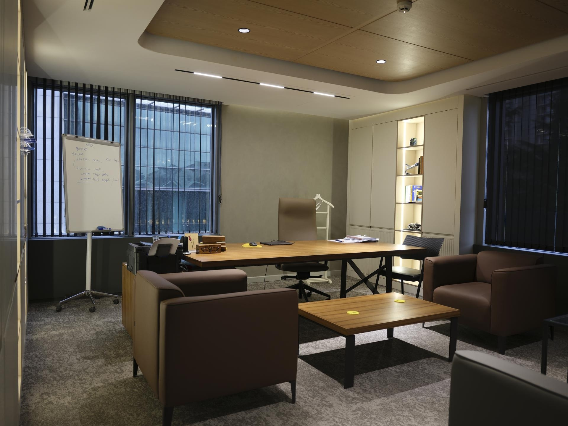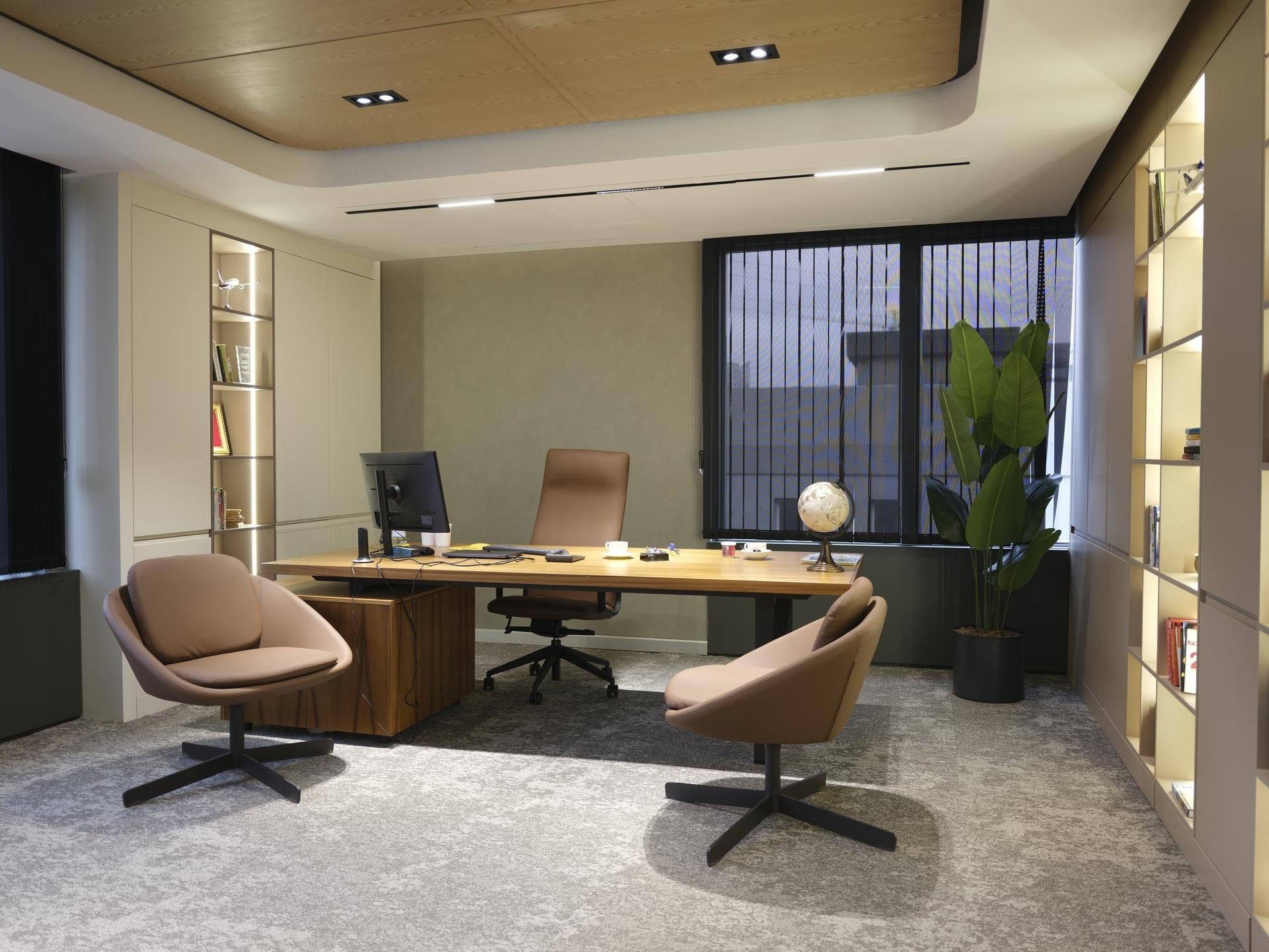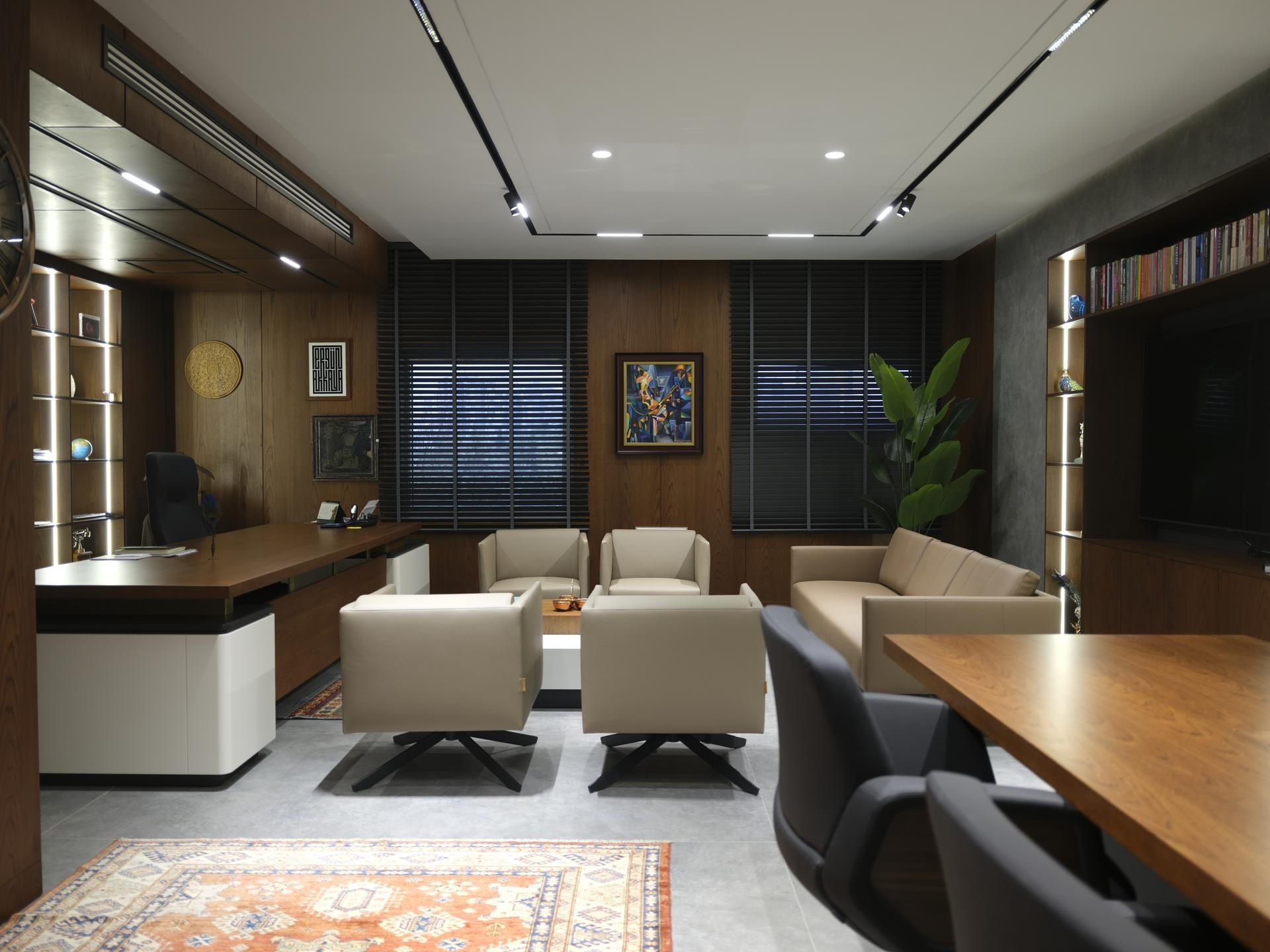 Yönetim Kurulu ve Yönetici Odaları: En üst düzey malzeme kalitesinin kullanıldığı makam odalarında; zeminden tavana kütüphane sistemleri, doğal kaplama duvarlar ve özel ölçü makam masaları.