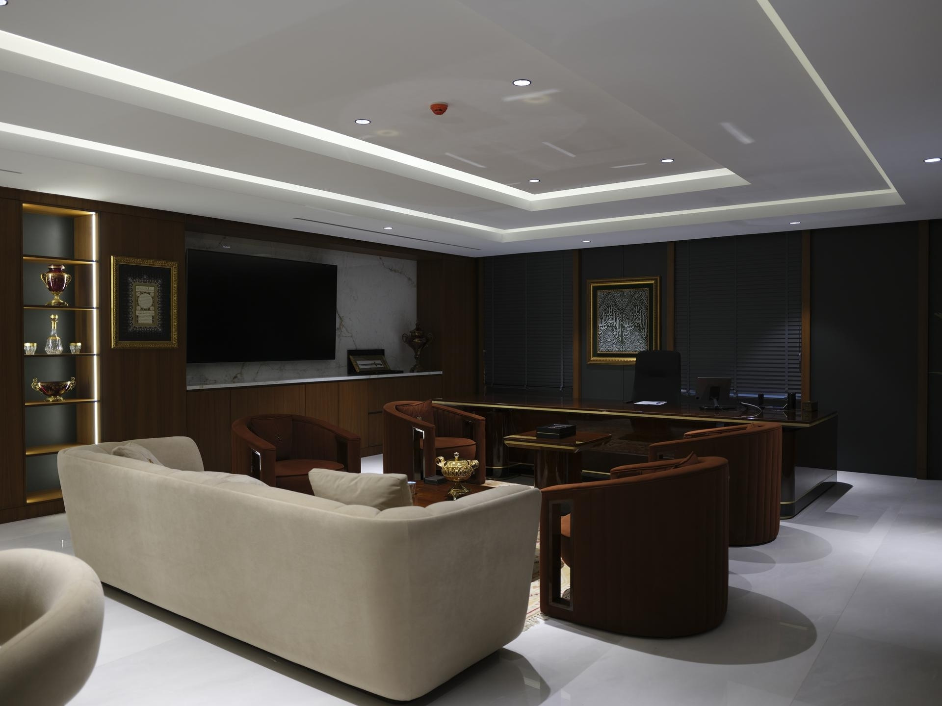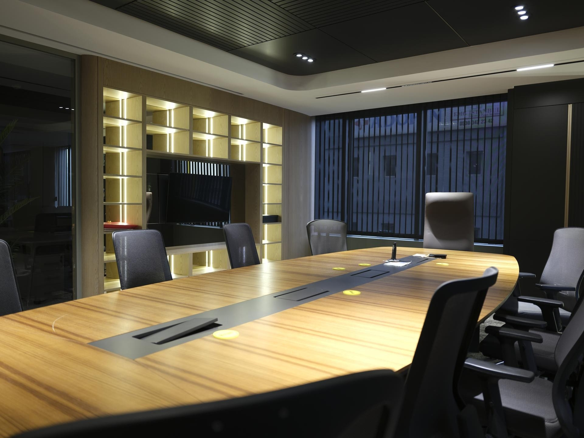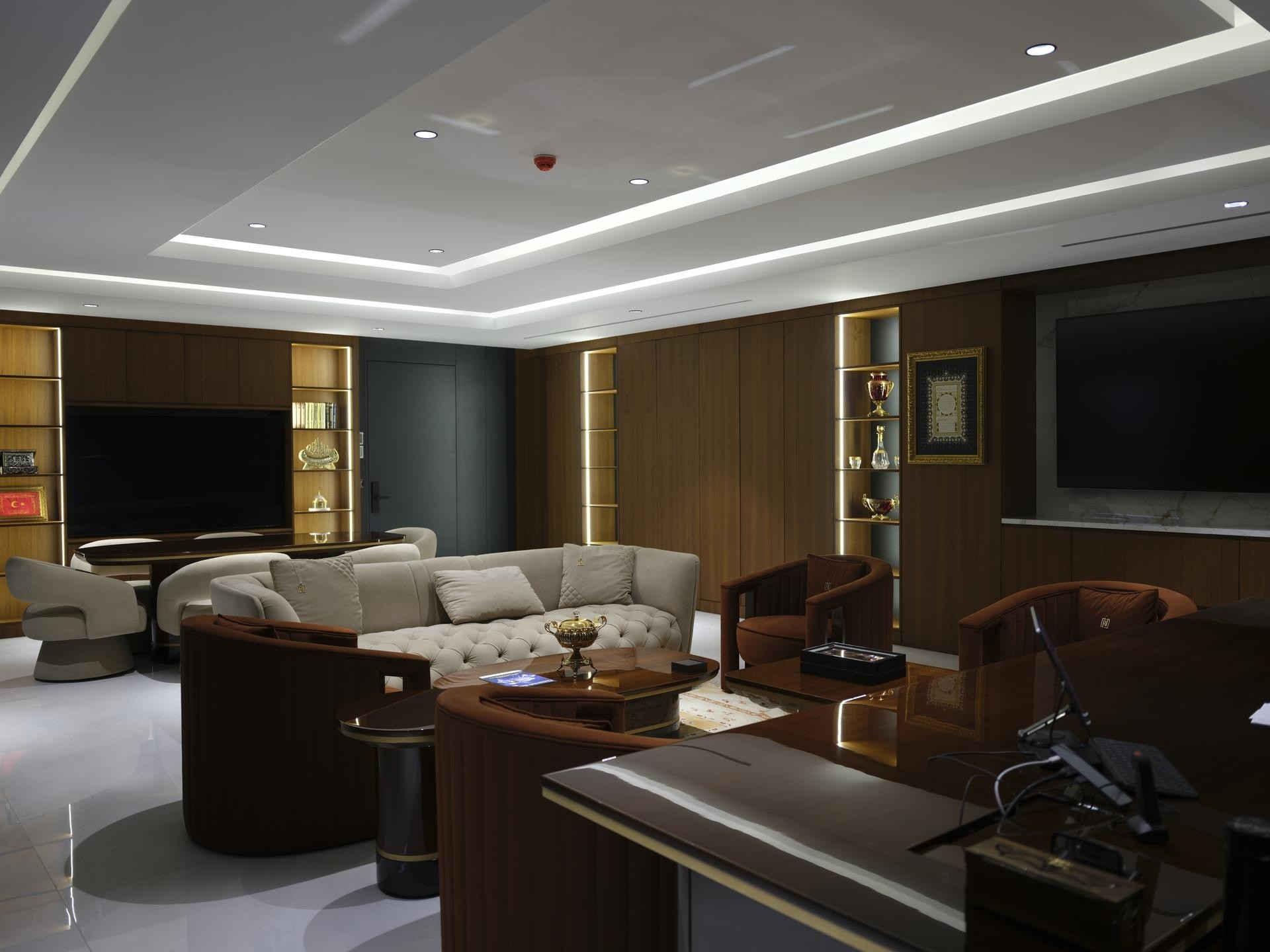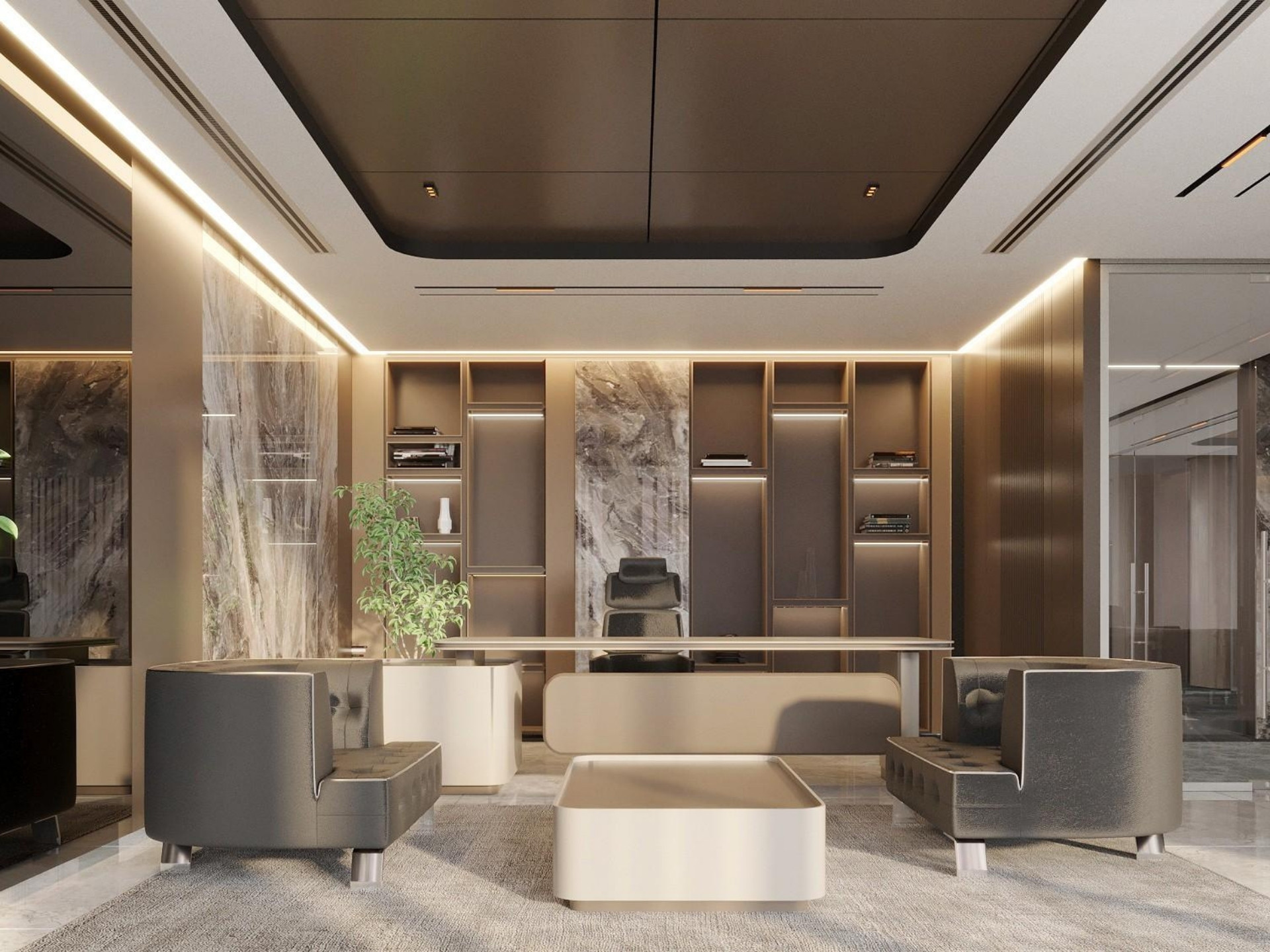 Yönetim Kurulu ve Yönetici Odaları: En üst düzey malzeme kalitesinin kullanıldığı makam odalarında; zeminden tavana kütüphane sistemleri, doğal kaplama duvarlar ve özel ölçü makam masaları.