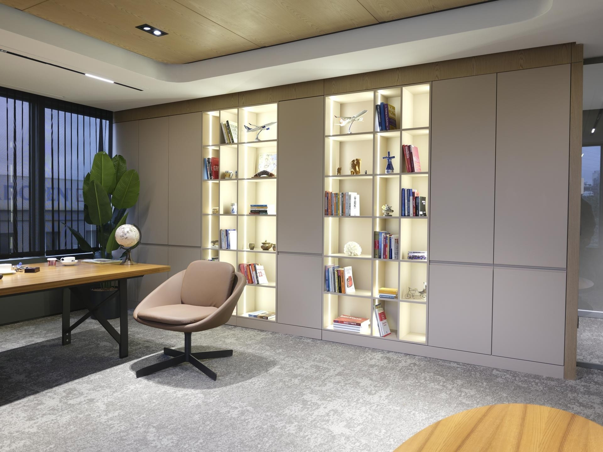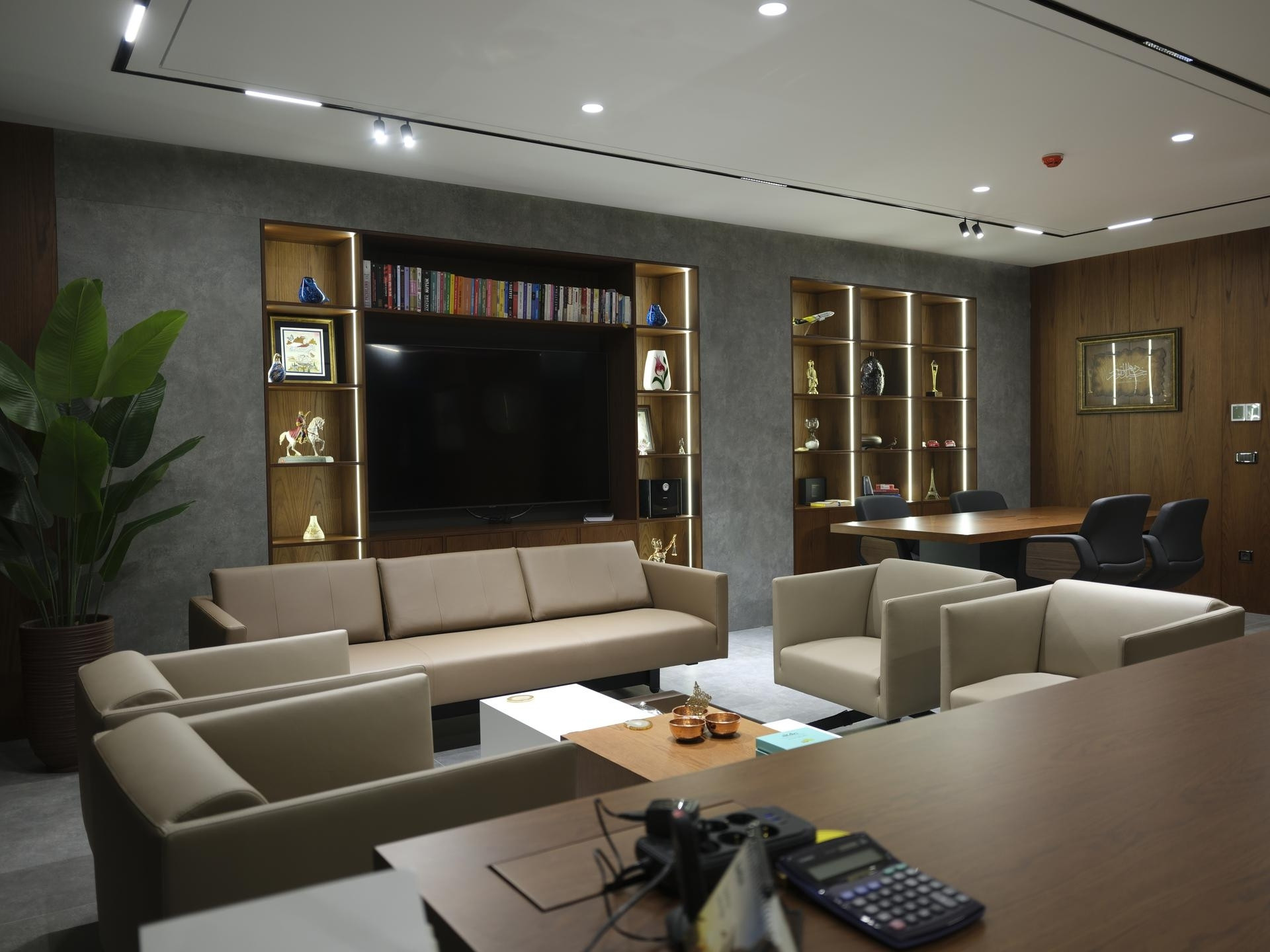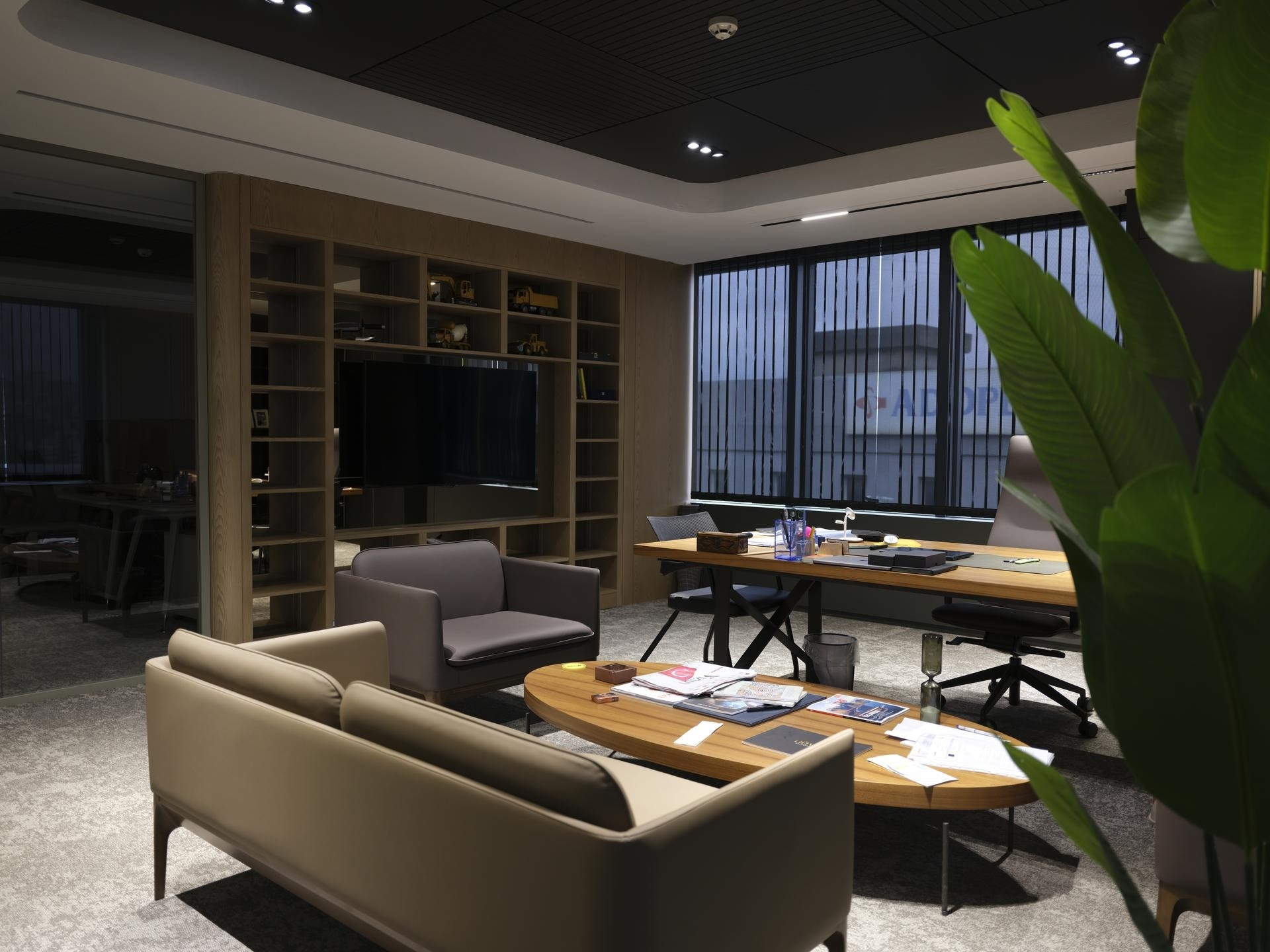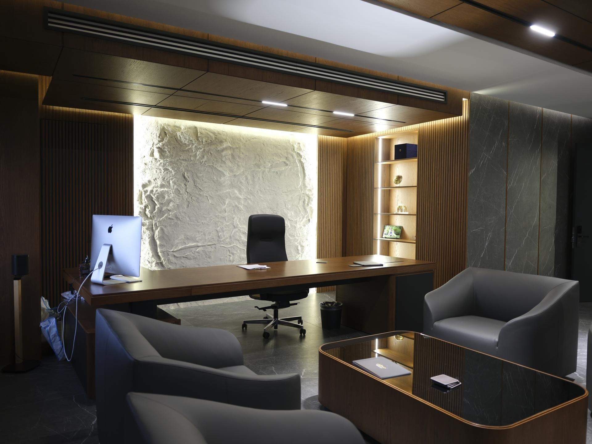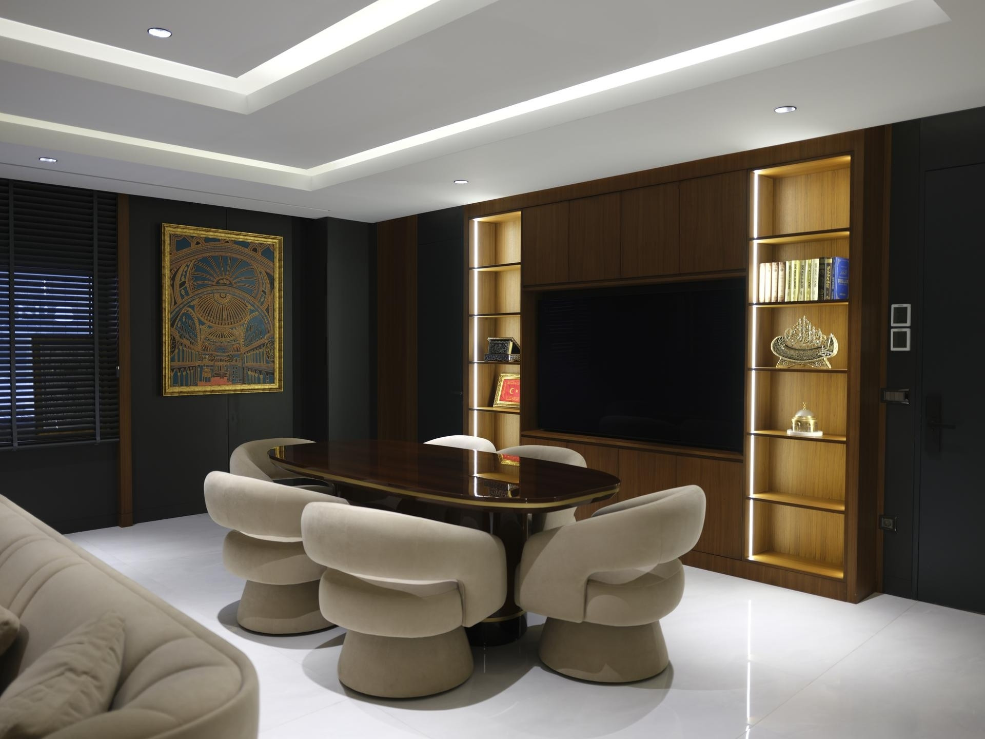 Yönetim Kurulu ve Yönetici Odaları: En üst düzey malzeme kalitesinin kullanıldığı makam odalarında; zeminden tavana kütüphane sistemleri, doğal kaplama duvarlar ve özel ölçü makam masaları.