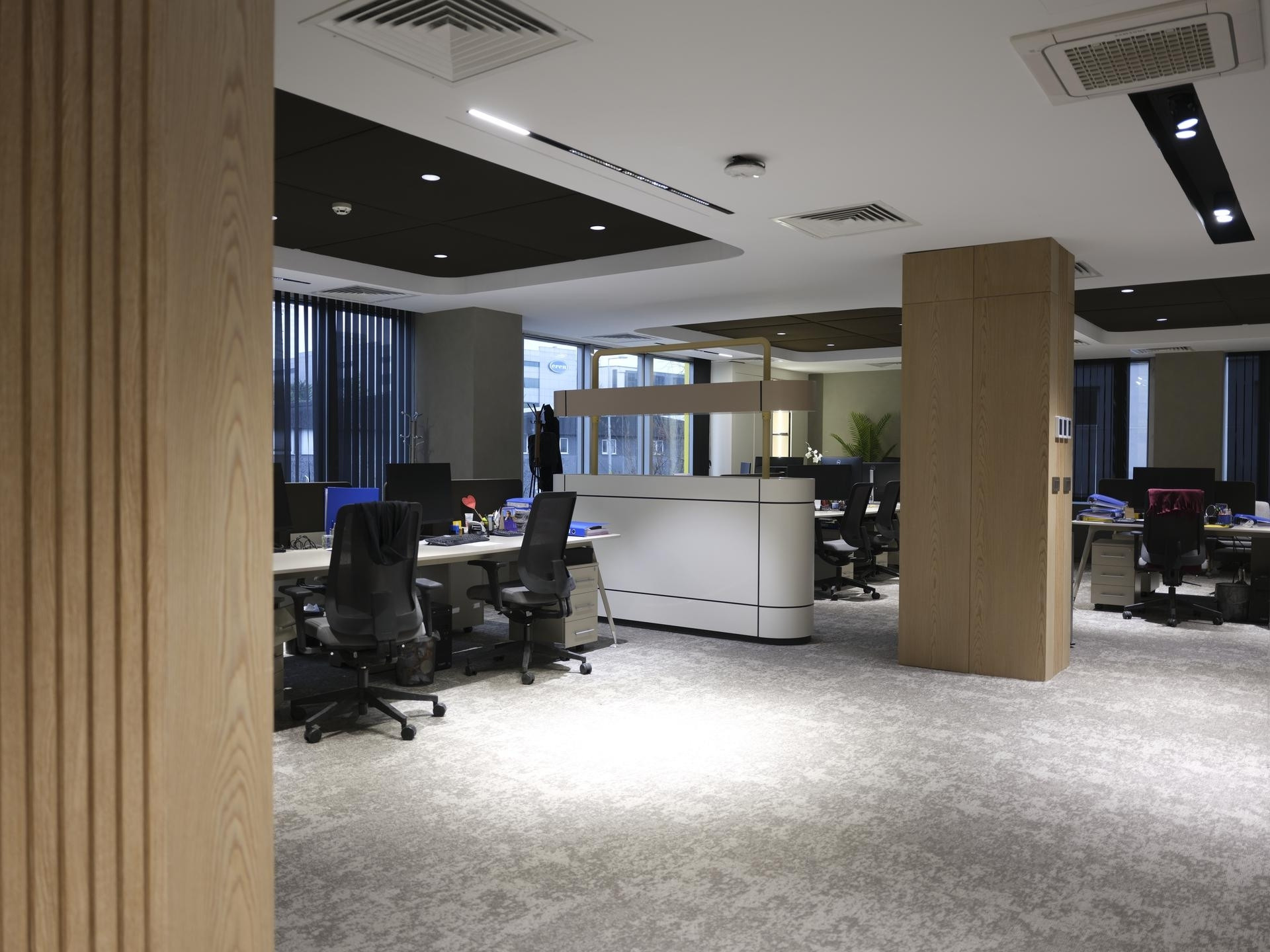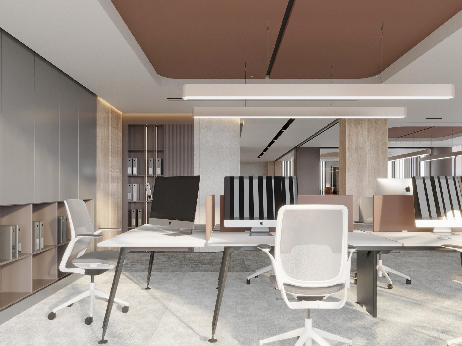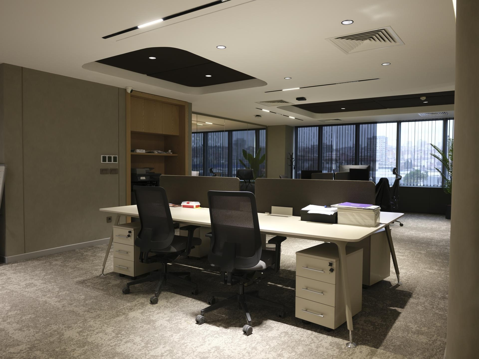 Finans ve Muhasebe Birimleri: Yoğun çalışma temposuna uygun, ergonomi ve evrak arşivleme ihtiyaçlarının çözüldüğü operasyonel dolap sistemleri ve ahşap bölücüler.