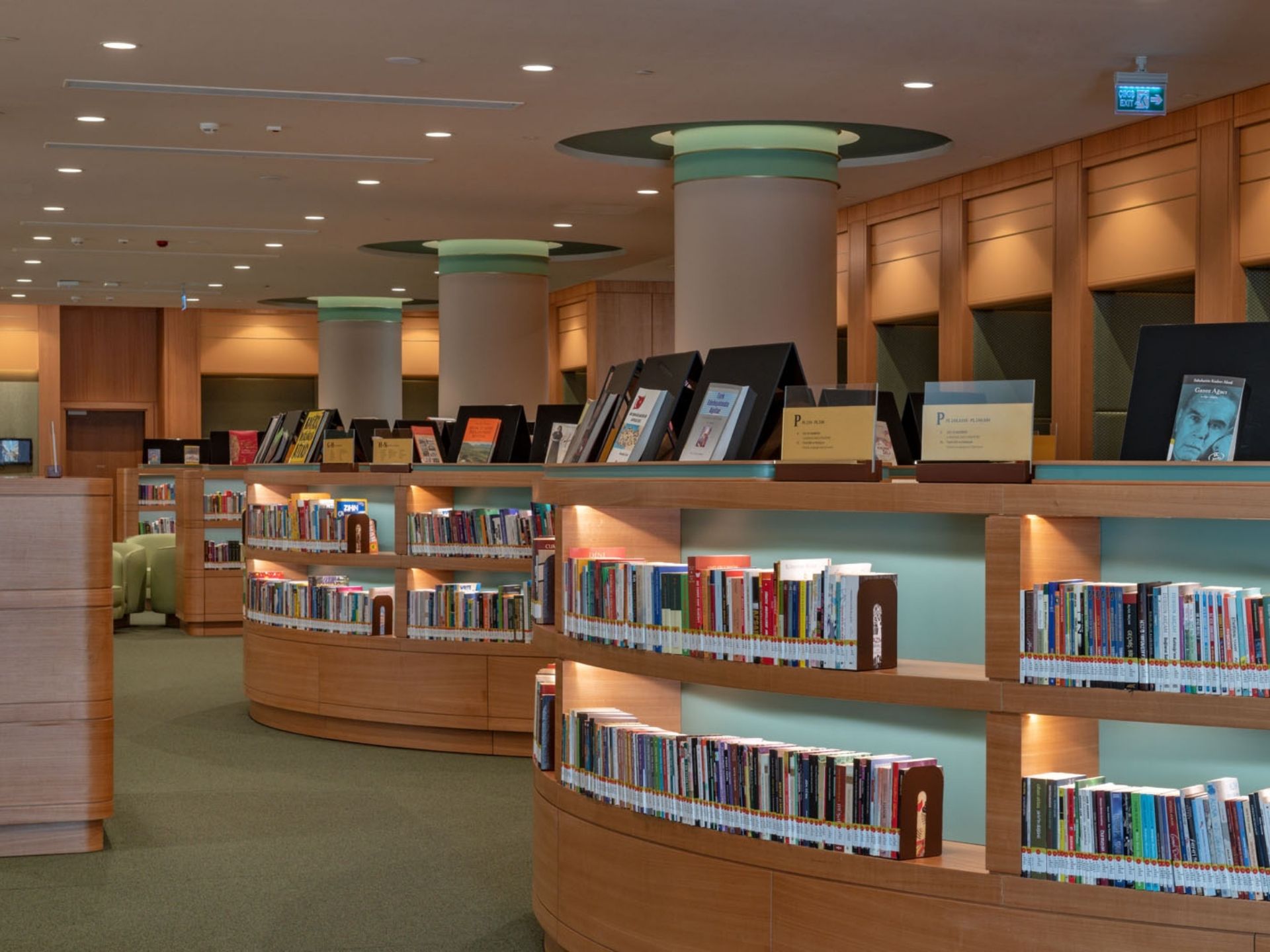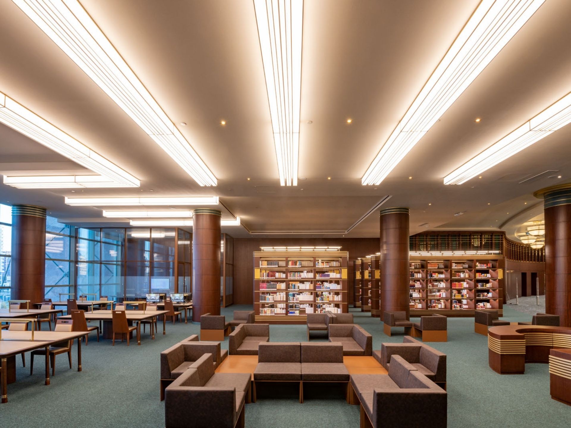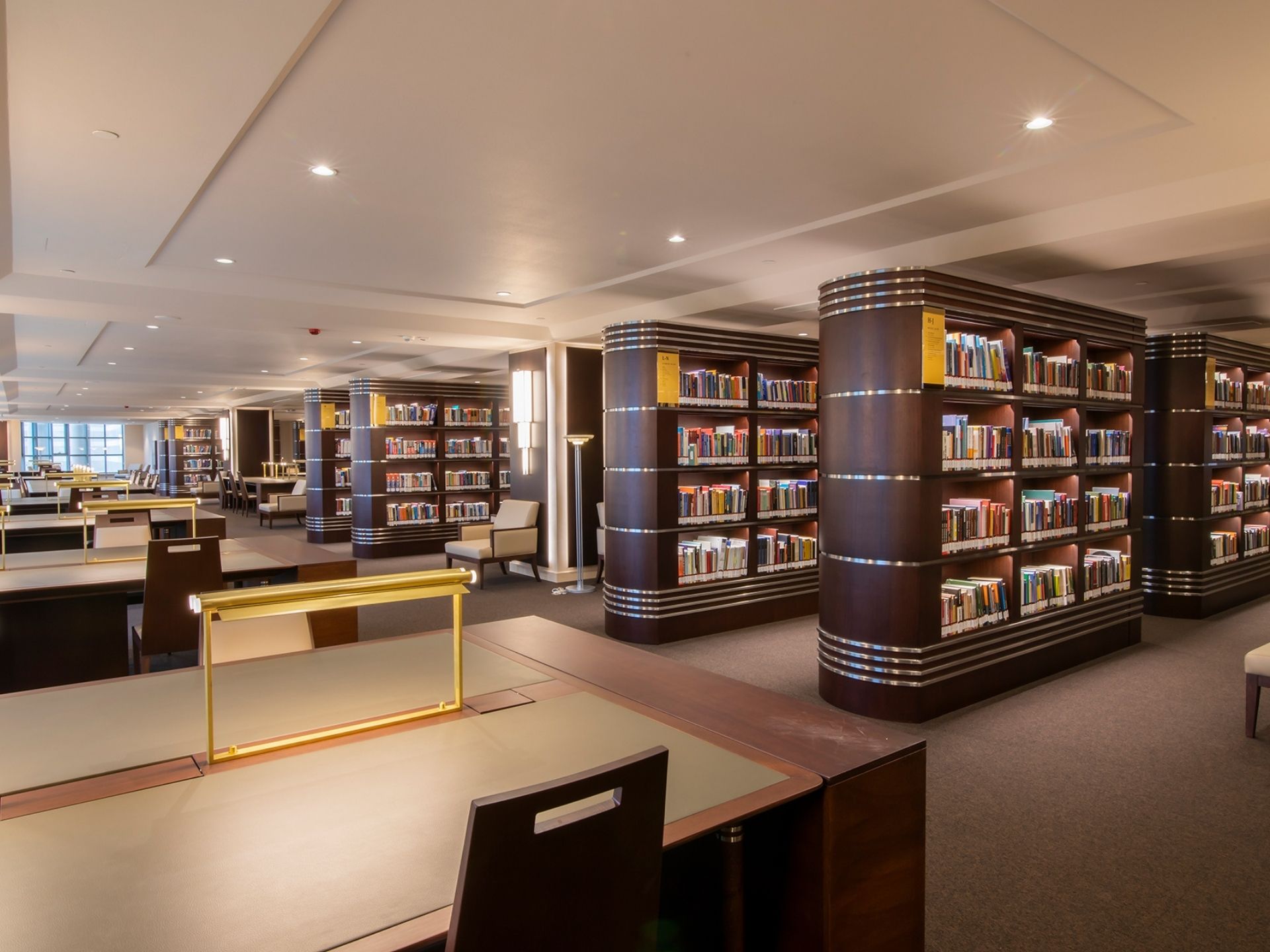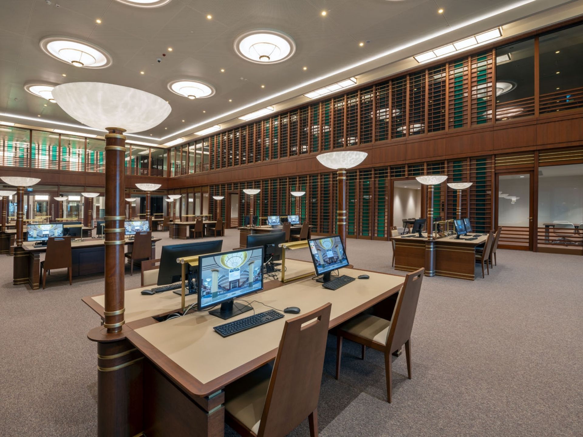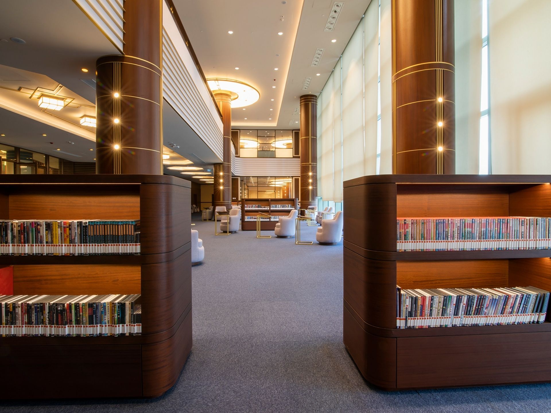 Kolon ve Duvar Kaplamaları: Kütüphanenin görkemli atmosferini tamamlayan, tavana kadar uzanan dekoratif ahşap kolon giydirmeleri ve akustik özellikli duvar panelleri.
