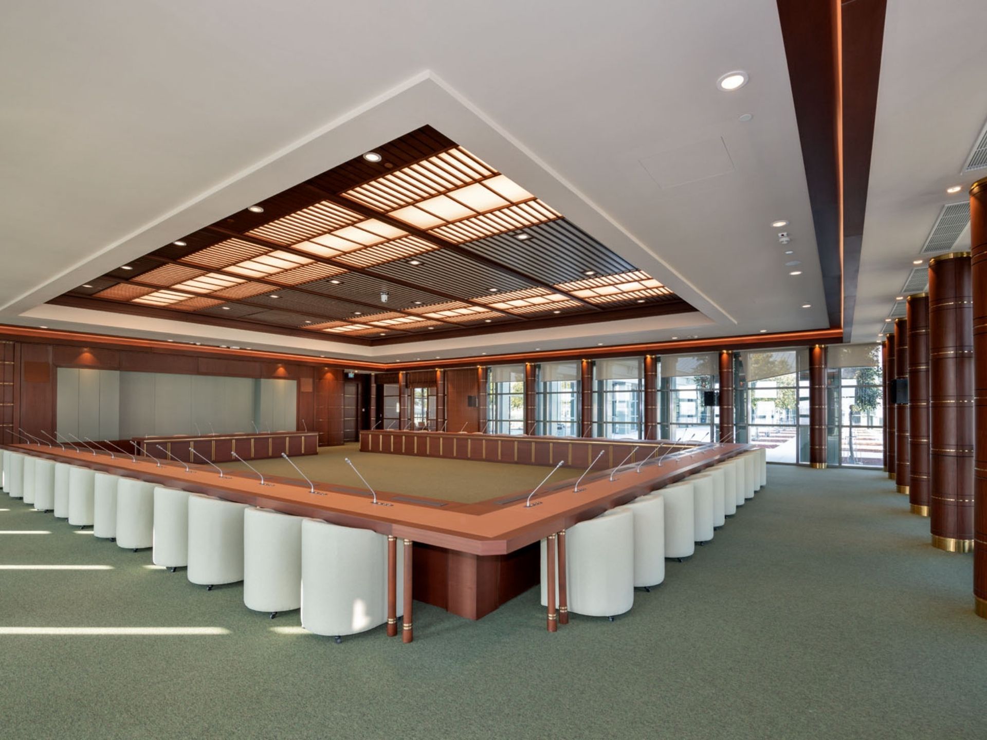 Grup Çalışma ve Toplantı Masaları: Yoğun kullanıma uygun, masif detayların ve ergonominin ön planda tutulduğu okuma ve araştırma masaları. Firmamız, bu projede devlet ricaline ve kamuya hizmet veren bir yapının gerektirdiği en üst düzey malzeme ve işçilik kalitesini başarıyla uygulamıştır.
