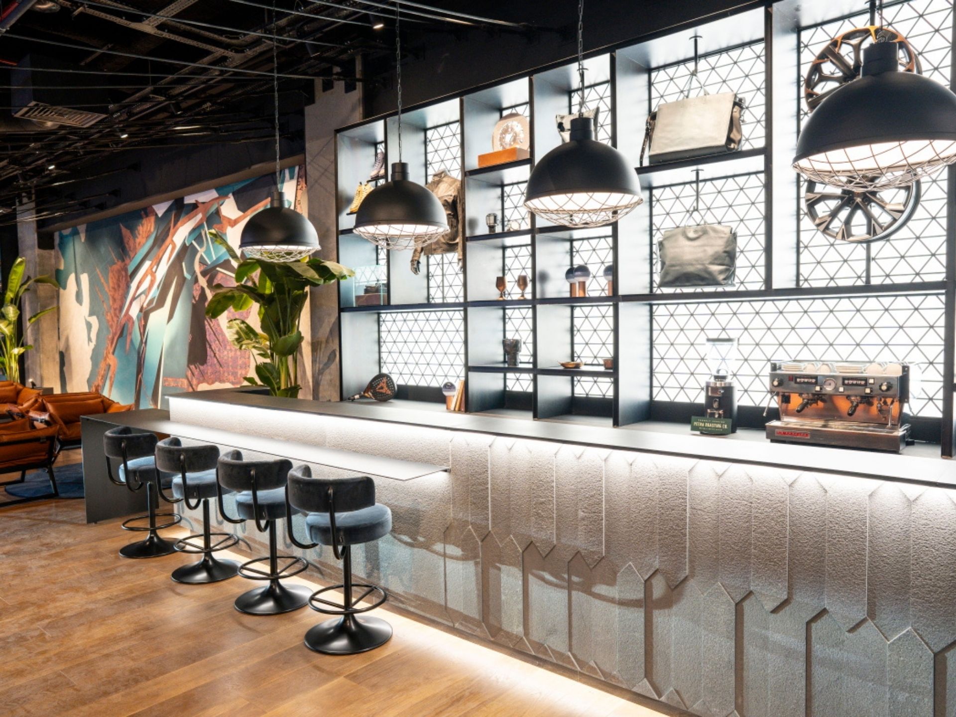 Bar ve Karşılama Alanı: Mekânın sosyal etkileşim noktası olan bar bölümünde, beton dokulu özel yüzey kaplamaları ve metal konstrüksiyon detayları bir araya getirilerek, dayanıklı ve estetik bir hizmet alanı oluşturulmuştur.