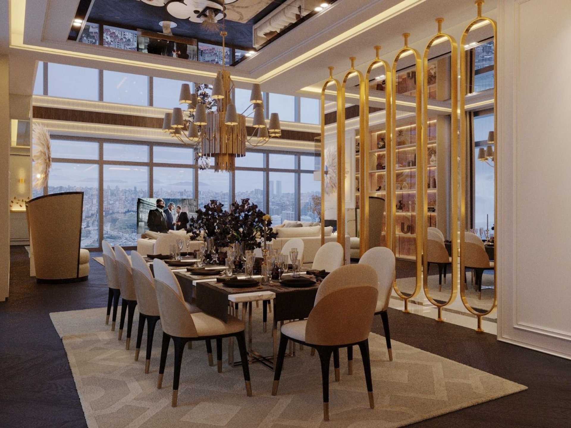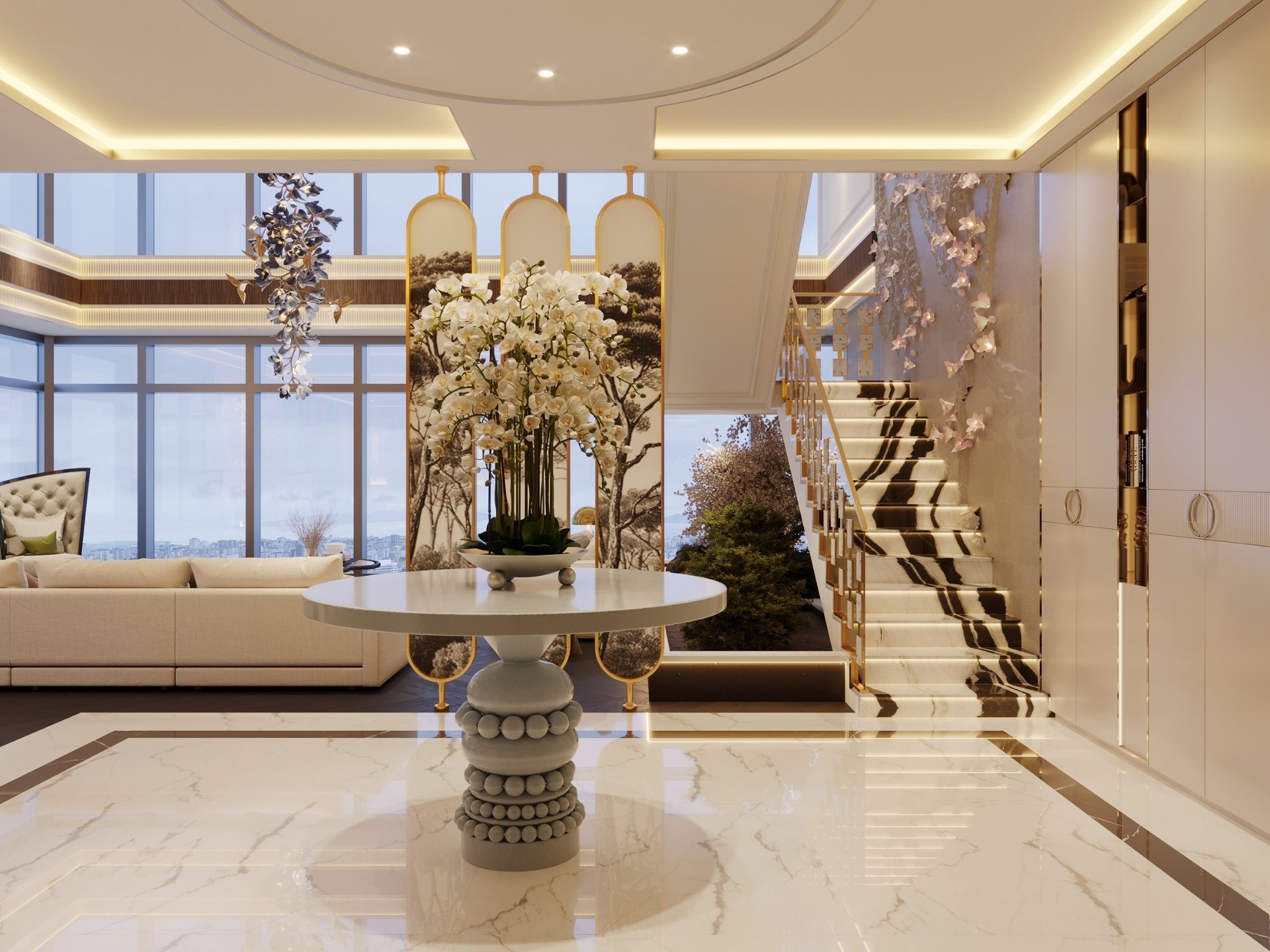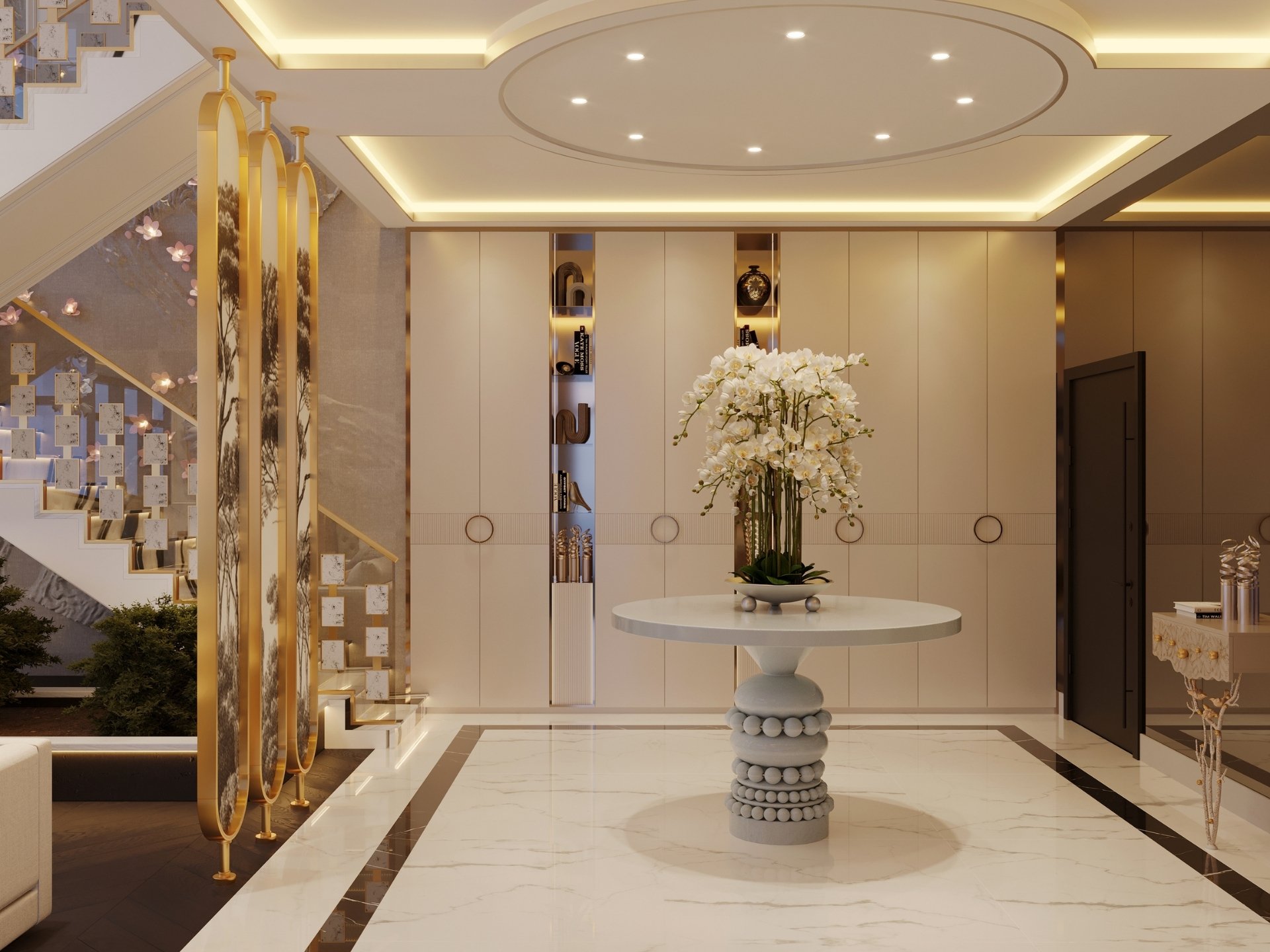 Giriş ve Karşılama: Daireye ilk adımda prestiji hissettiren; duvarla bütünleşik gizli vestiyer sistemleri, ayna detaylı dresuar alanları ve koridor boyunca devam eden dekoratif ahşap duvar panelleri.
