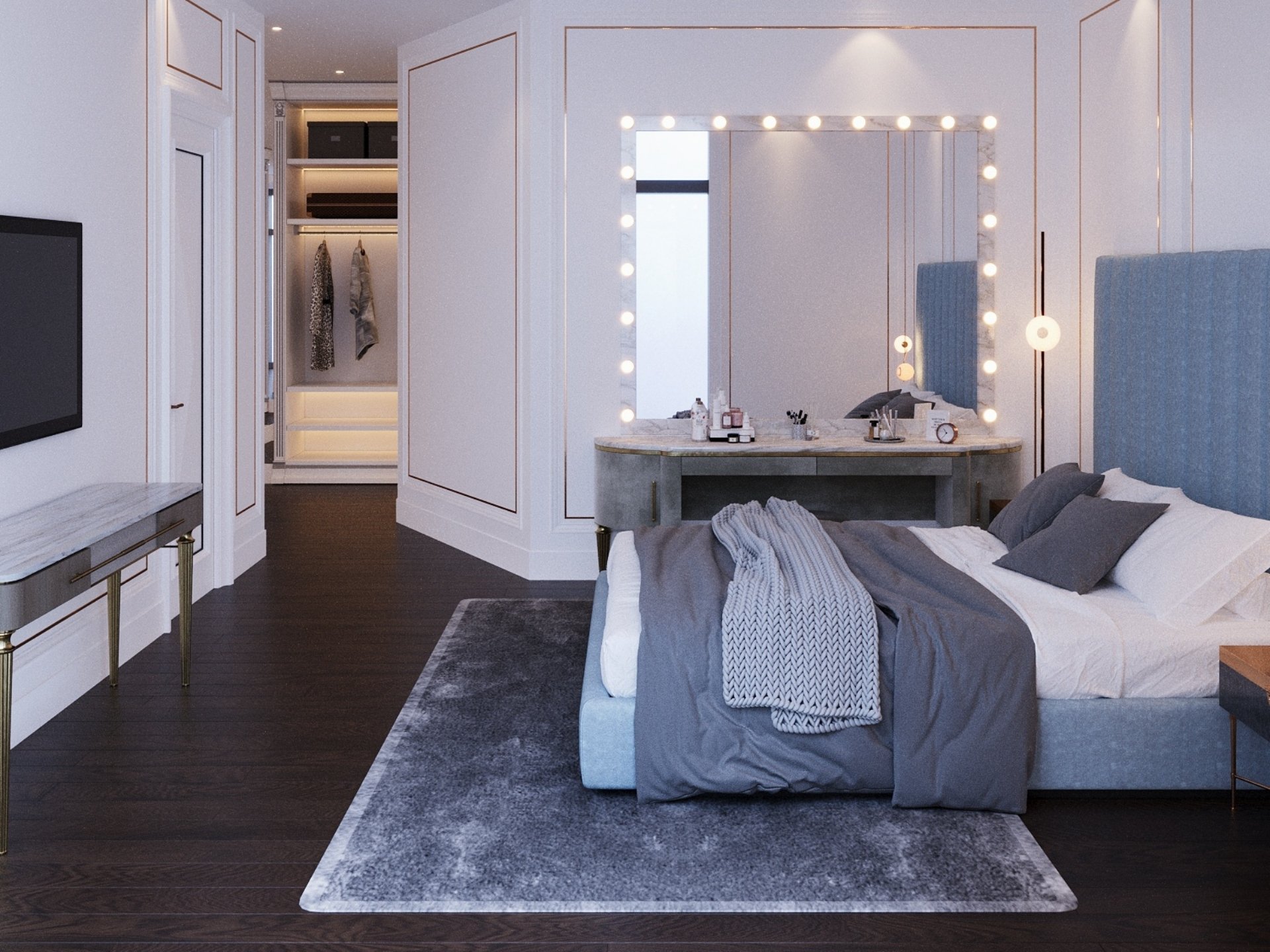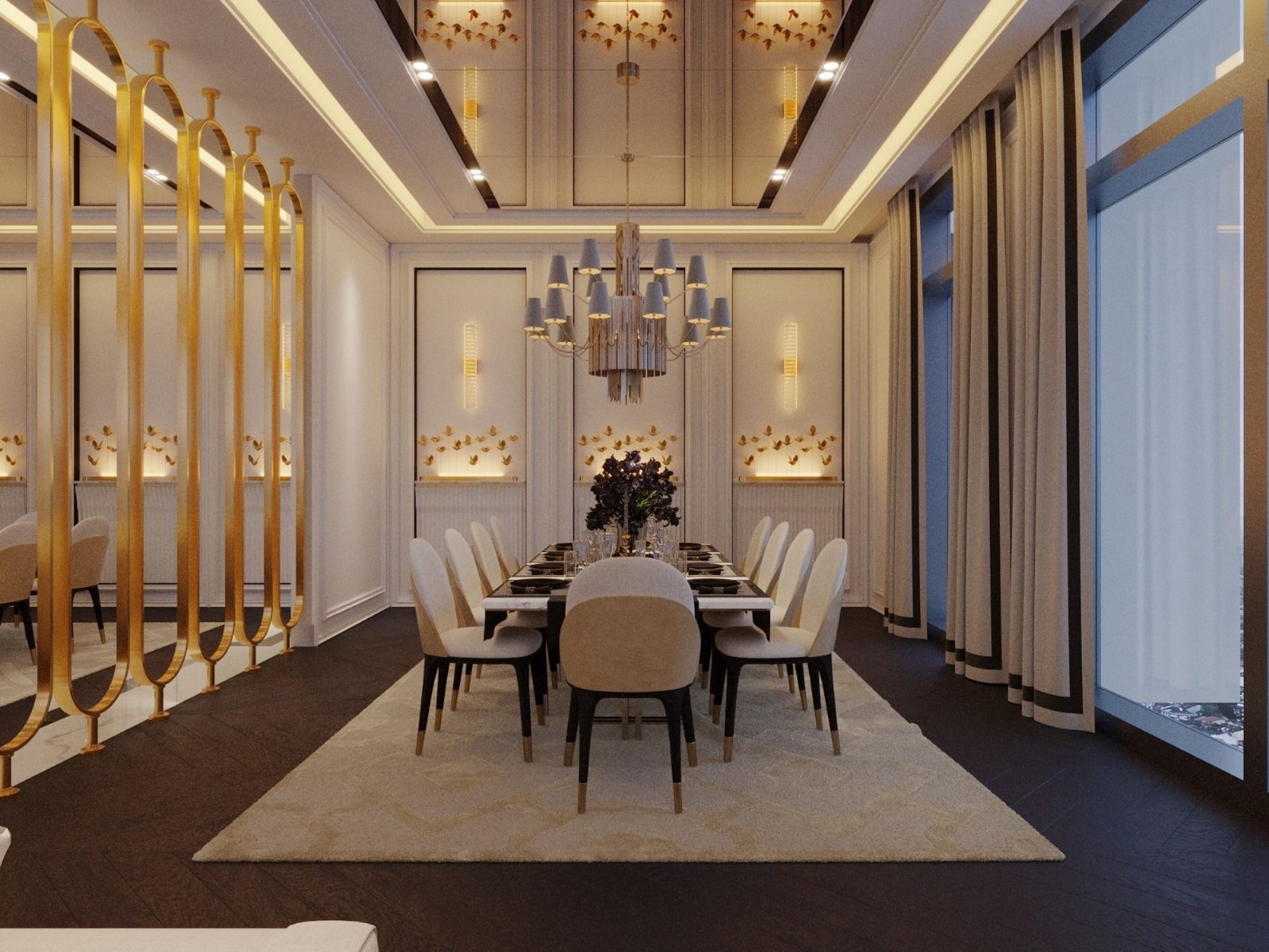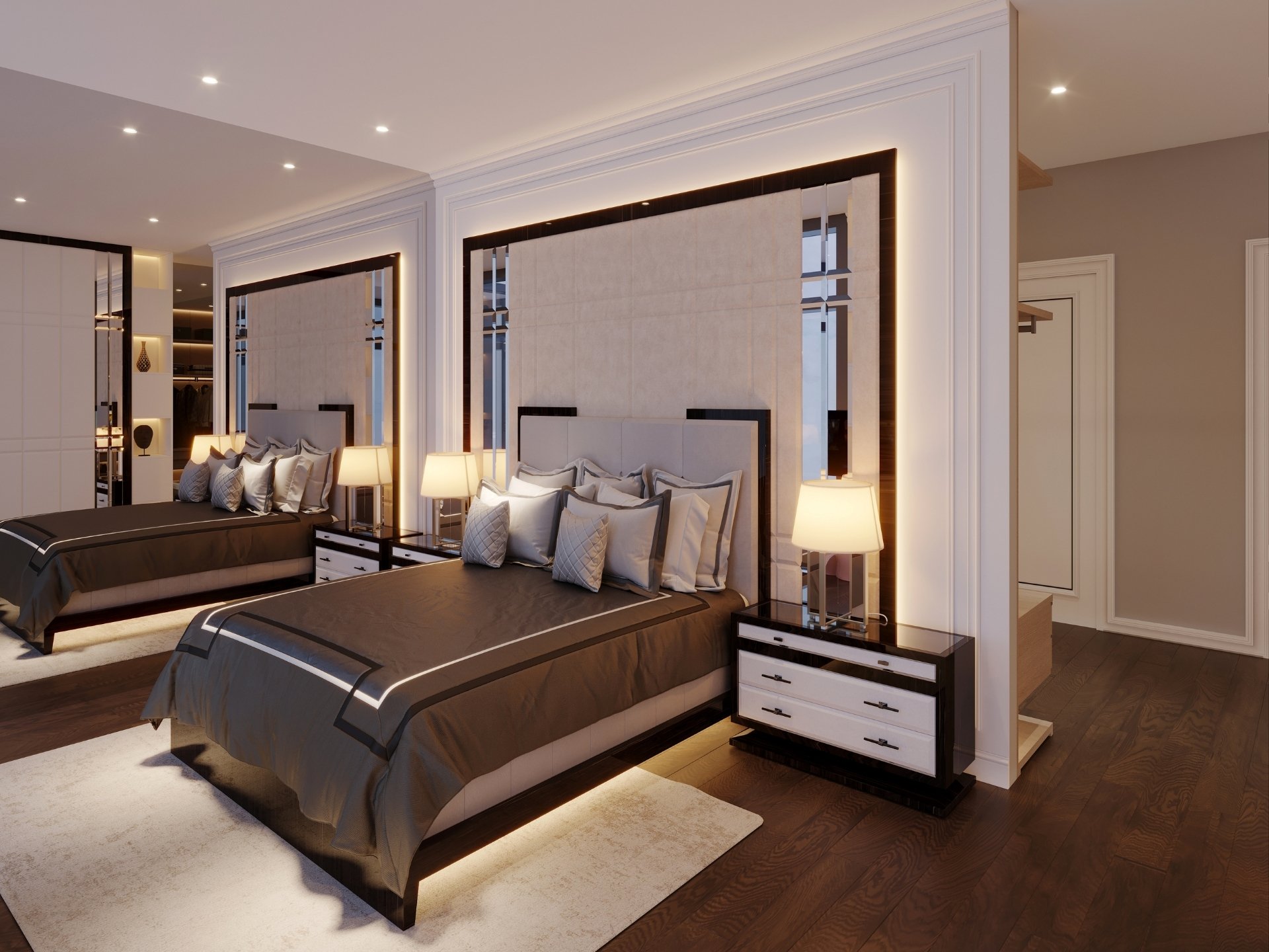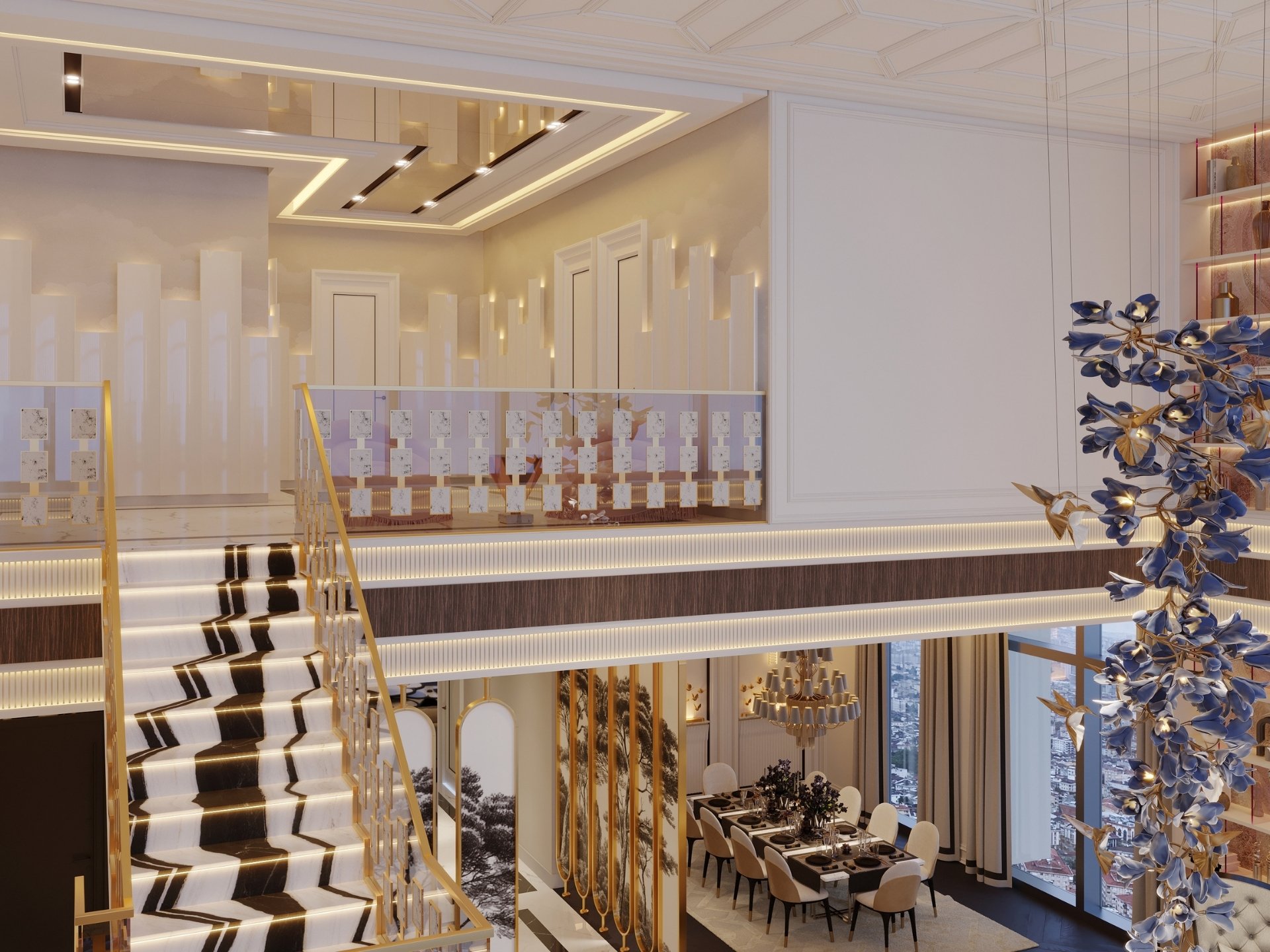 Giriş ve Karşılama: Daireye ilk adımda prestiji hissettiren; duvarla bütünleşik gizli vestiyer sistemleri, ayna detaylı dresuar alanları ve koridor boyunca devam eden dekoratif ahşap duvar panelleri.