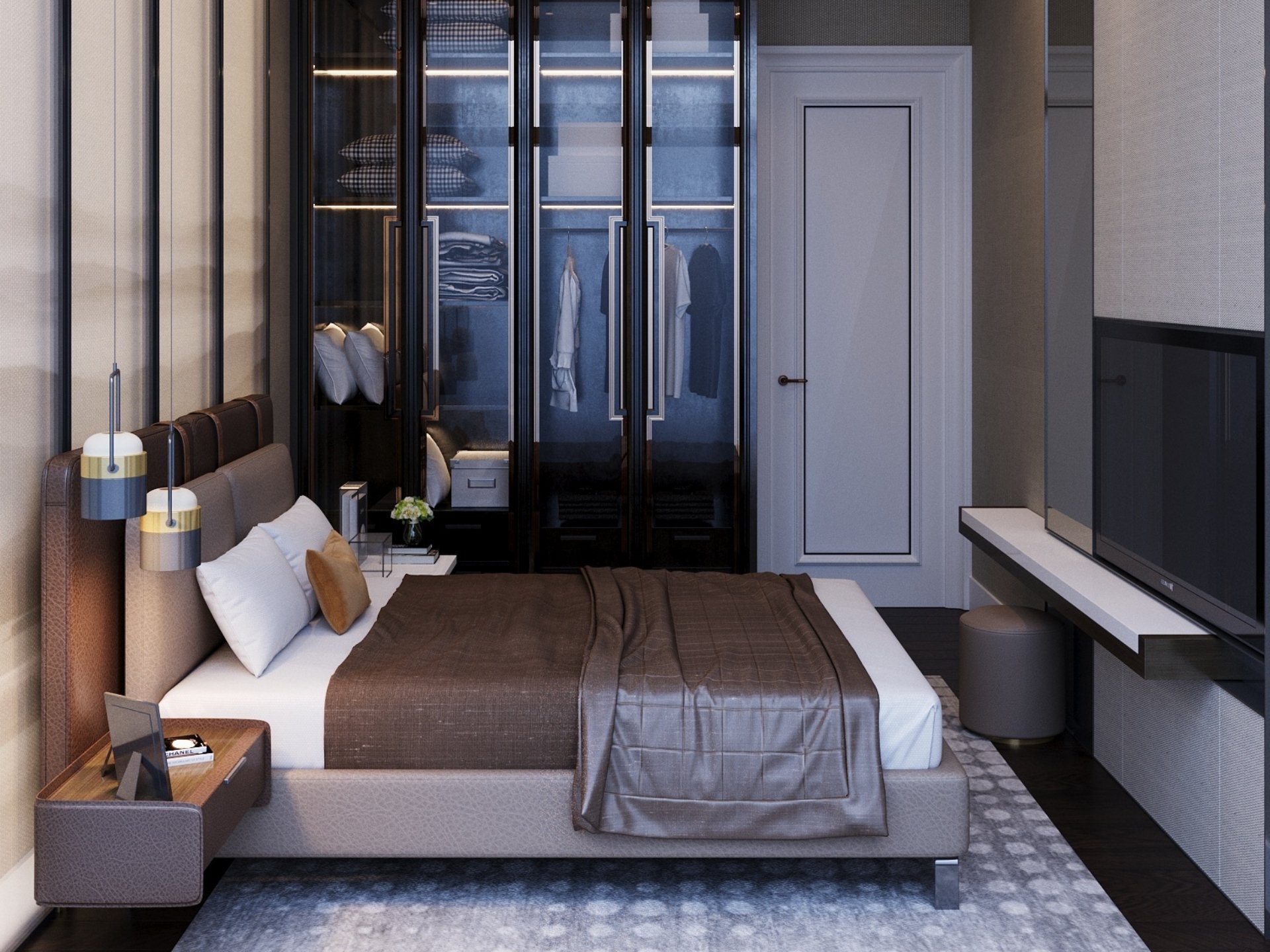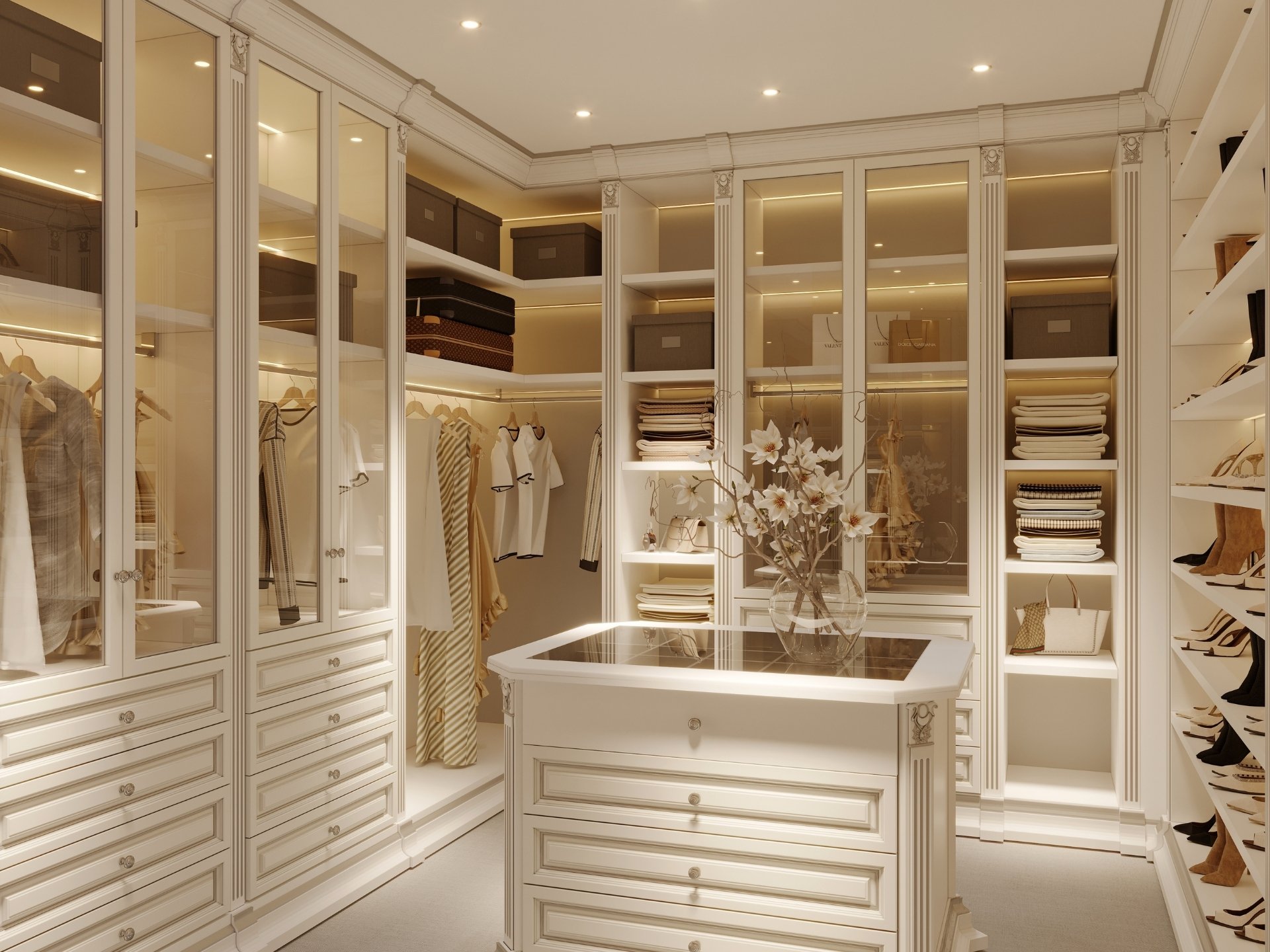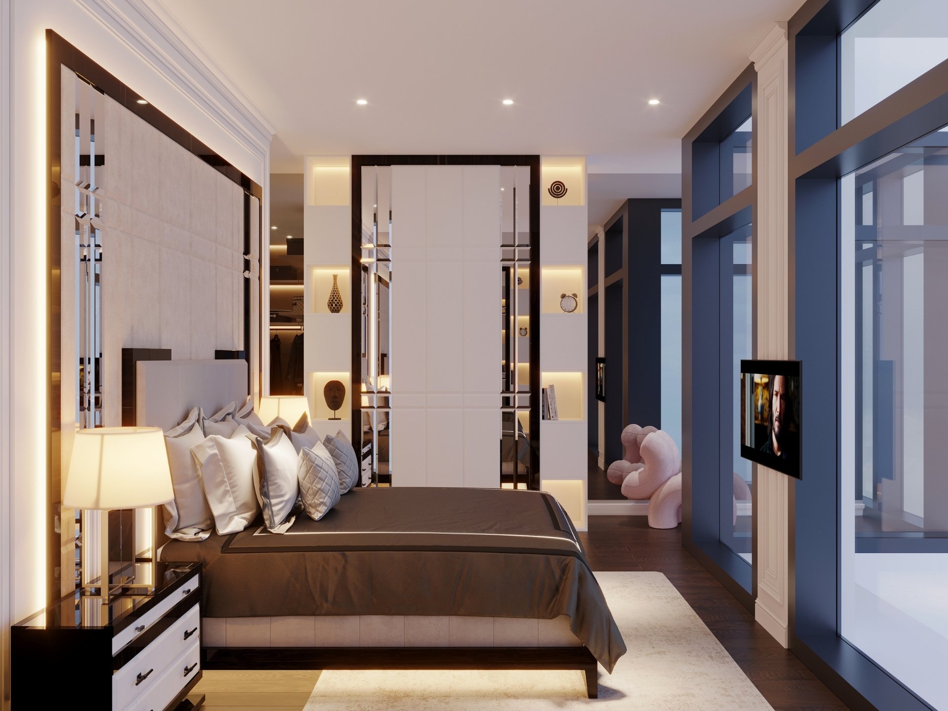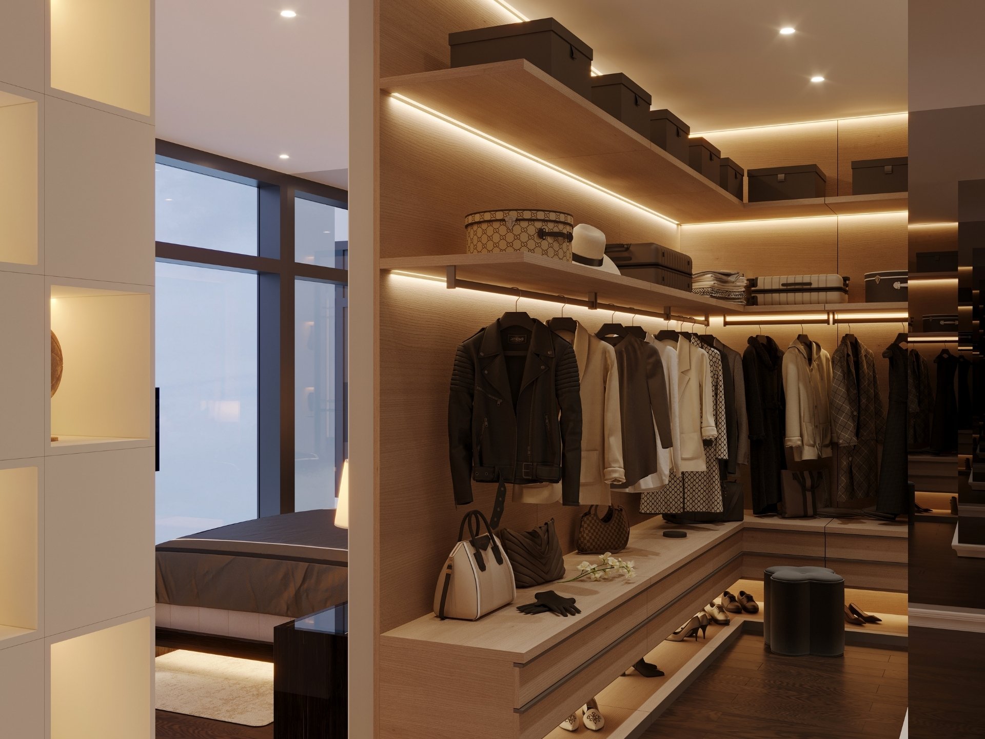 Giyinme Odaları: Kişisel bir butik lüksünde tasarlanan; bronz alüminyum çerçeveli ve füme cam kapaklı gardırop sistemleri. Entegre LED aydınlatmalar ve özel aksesuar çekmeceleriyle şık bir sergileme alanı.