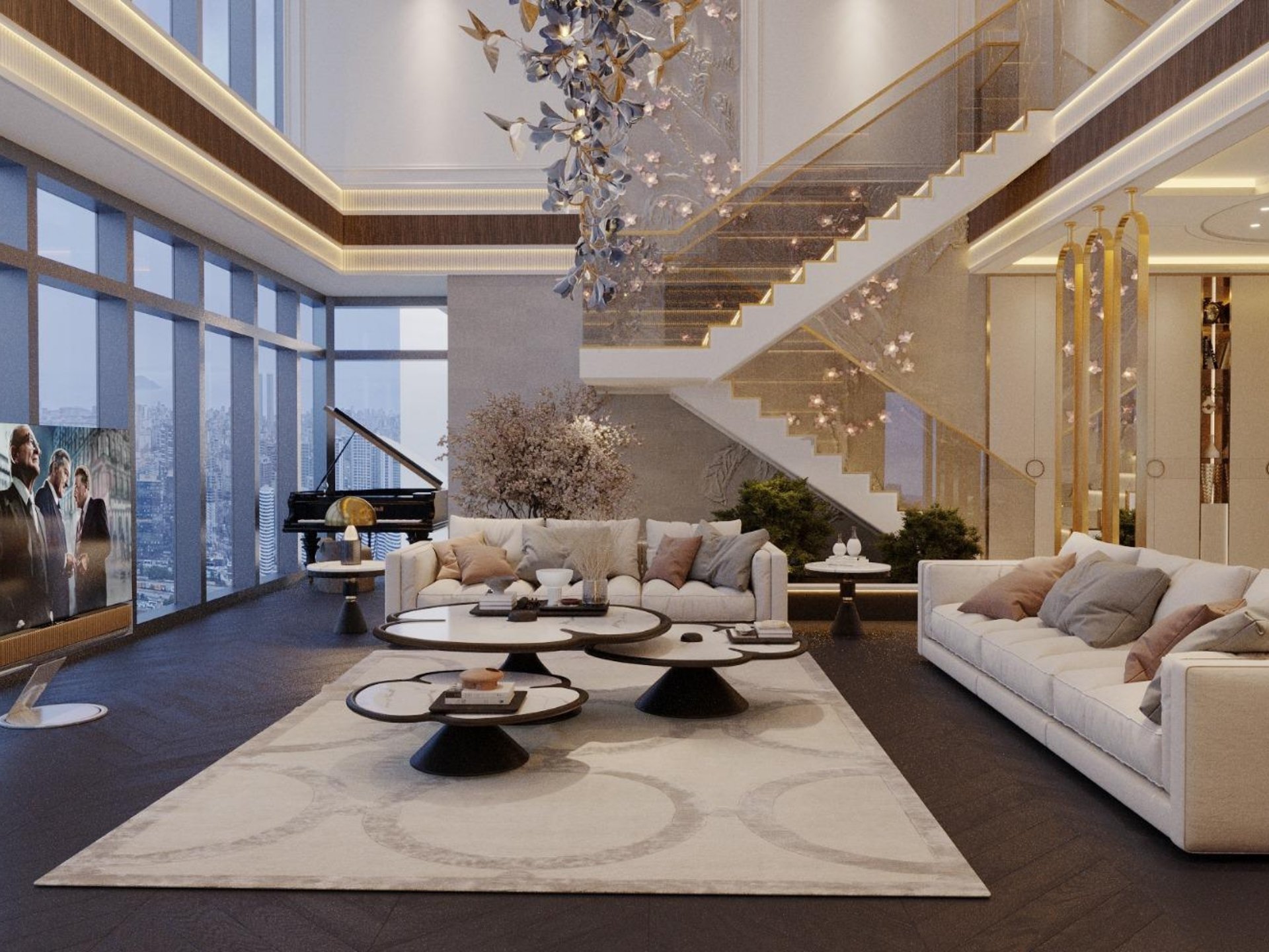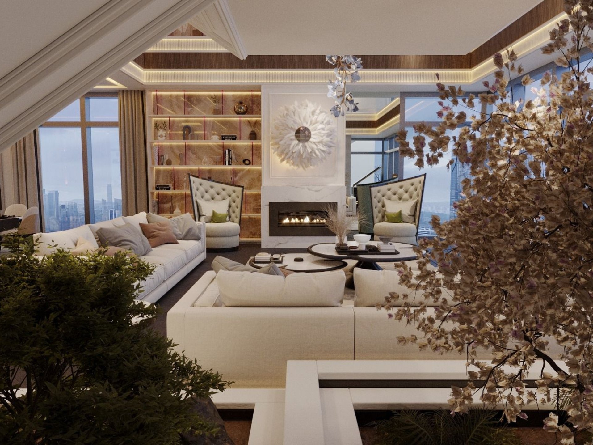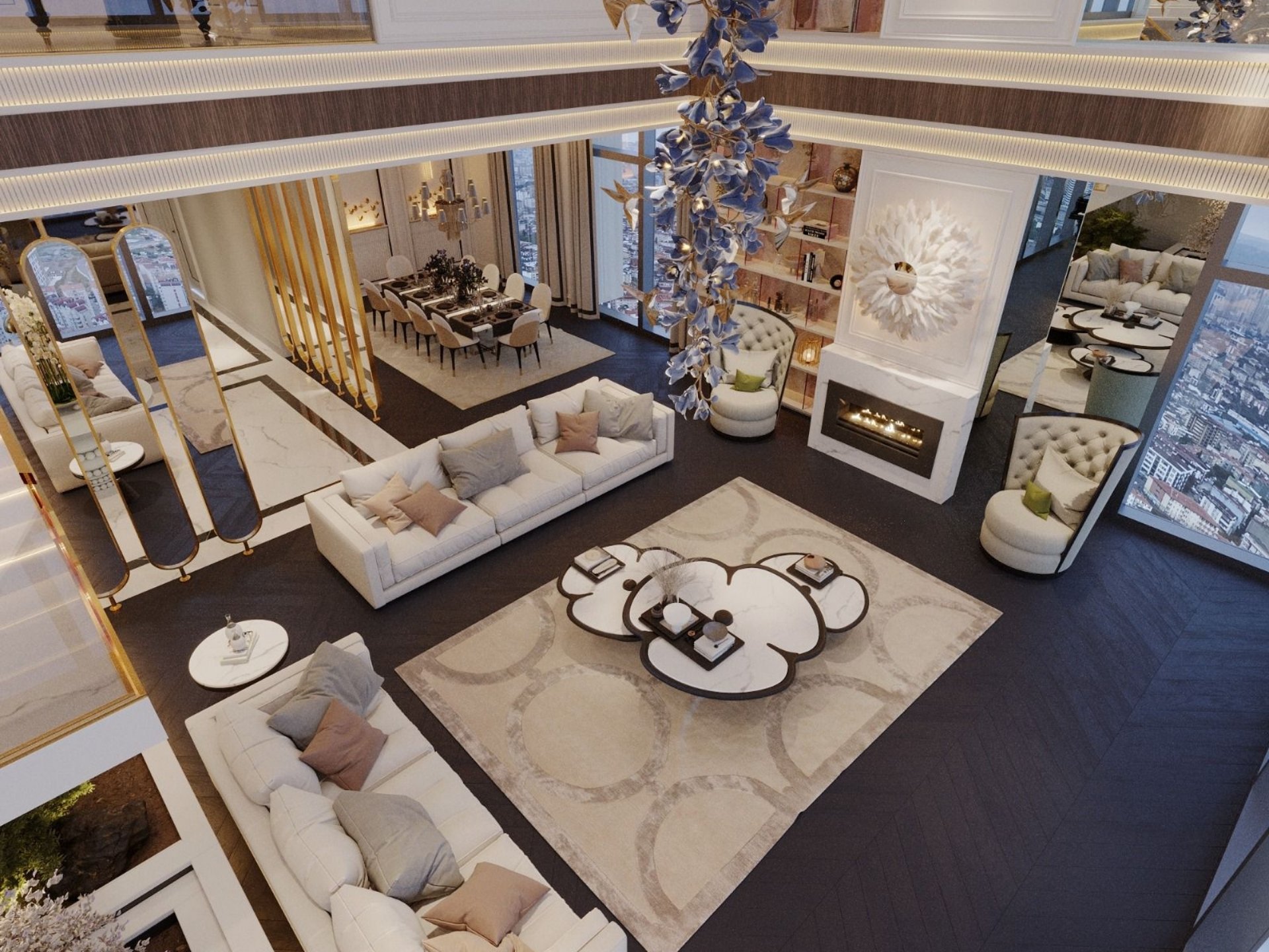 Salon ve Yaşam Alanı: Mekânın odak noktası olan TV ünitesinde; doğal mermer, ahşap ve pirinç (metal) detayların kusursuz birleşimi. Duvarlarda mekân derinliğini artıran lambri ve ayna uygulamaları.
