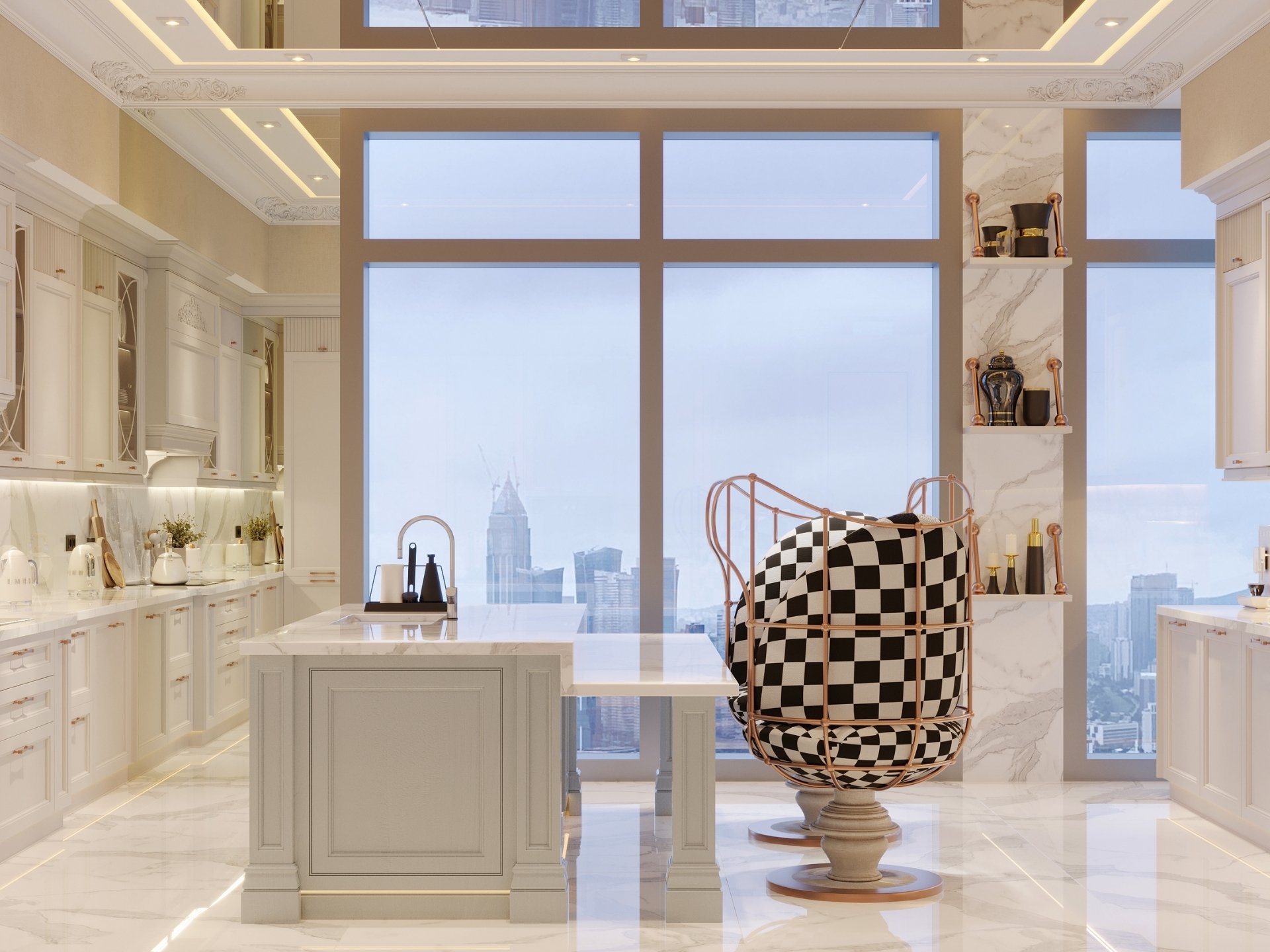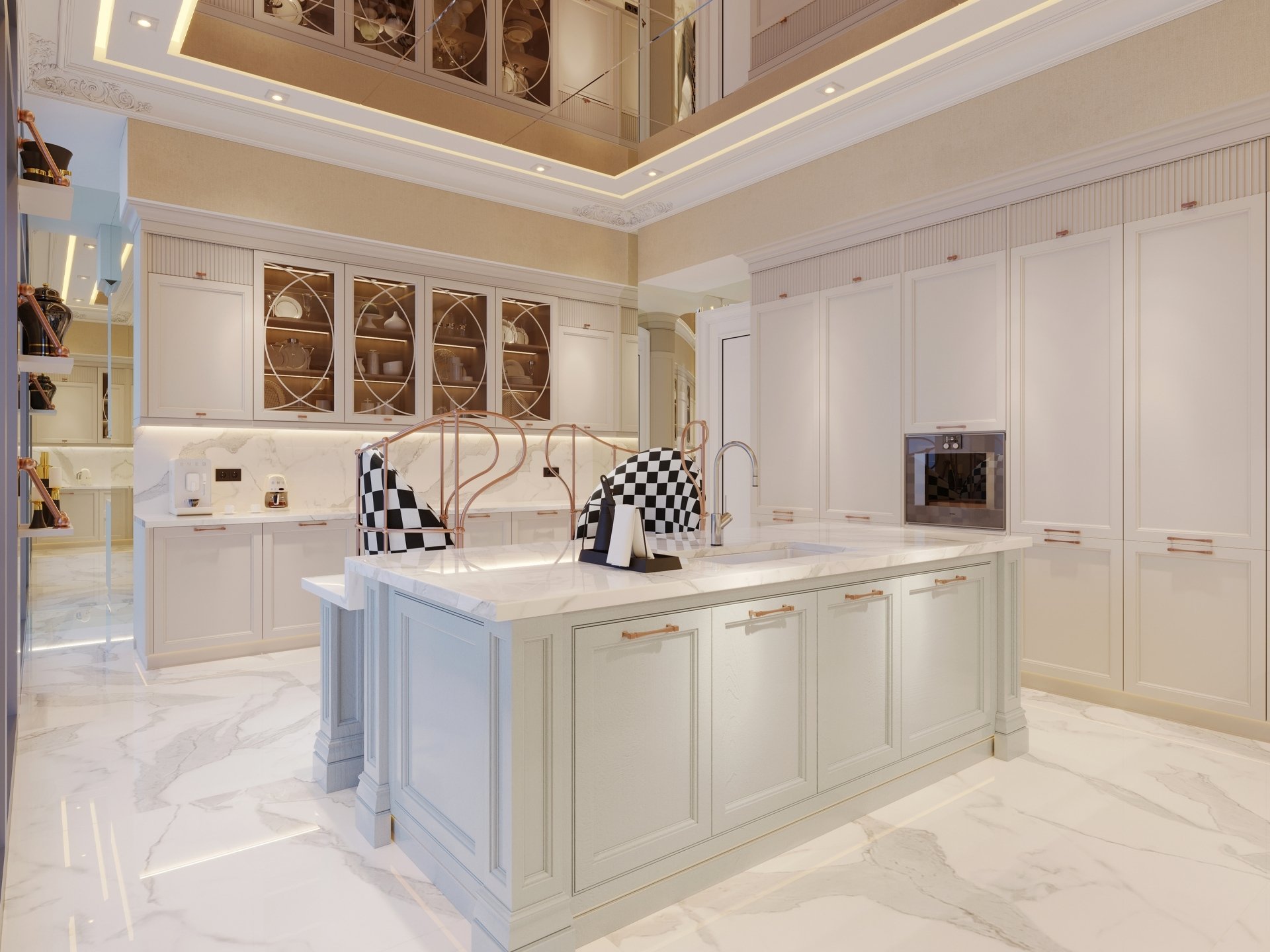 Mutfak: Fonksiyonelliğin estetikle buluştuğu; özel lake boyalı kulpsuz kapaklar, porselen tezgahla bütünleşen ada ünitesi ve teknolojik aksesuarlarla donatılmış iç tasarım.