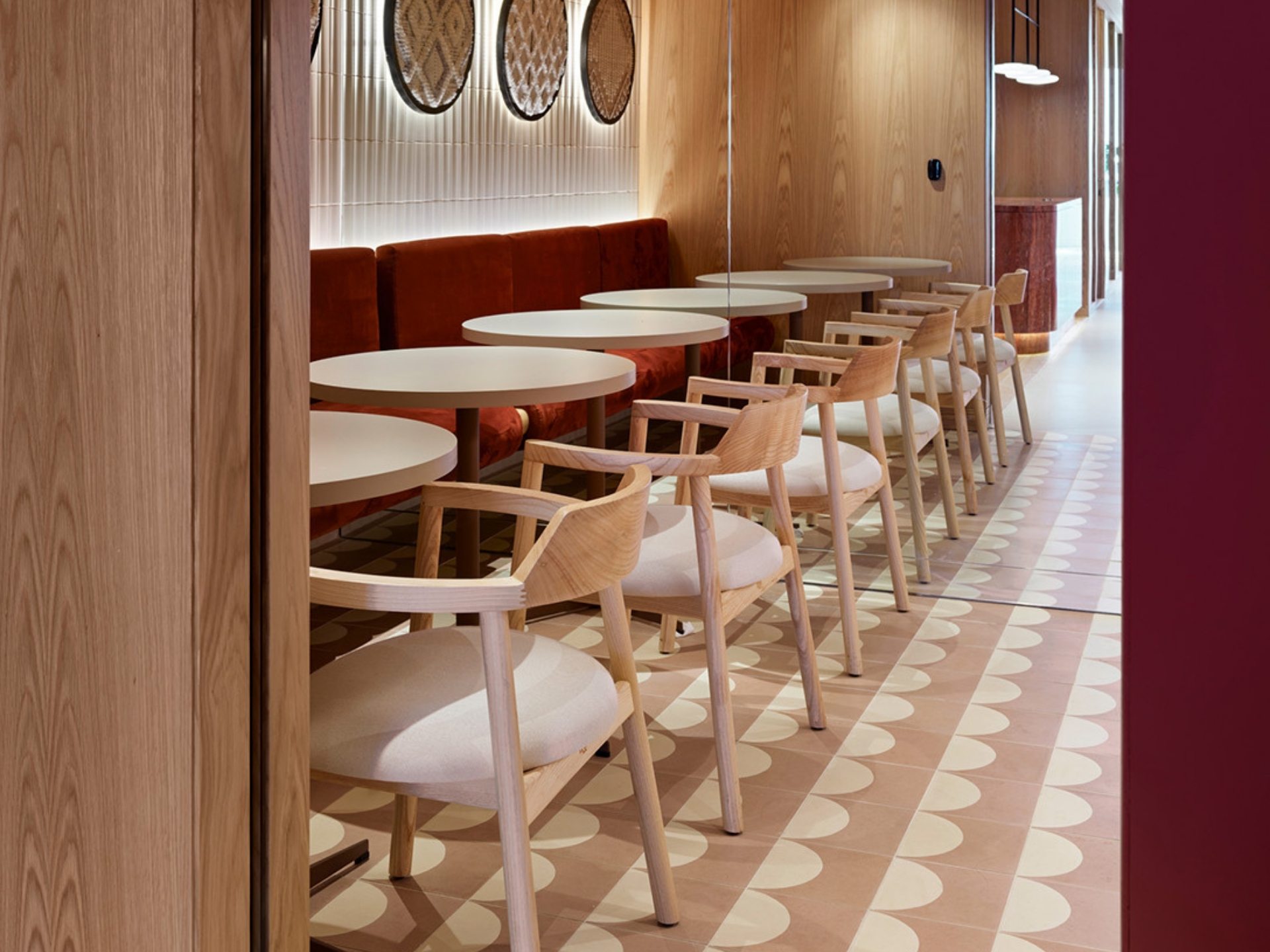 Kafeterya ve Sosyal Alanlar: Yeme-içme ve dinlenme bölümlerinde, mekânın sıcak atmosferini tamamlayan sabit ahşap üniteler ve servis bankoları.