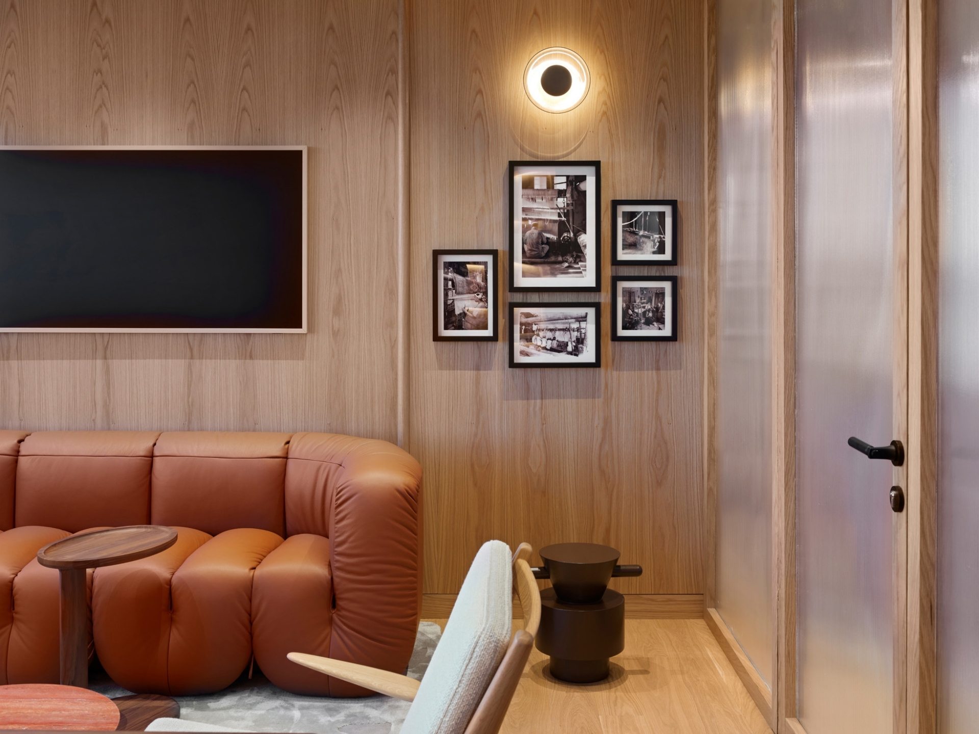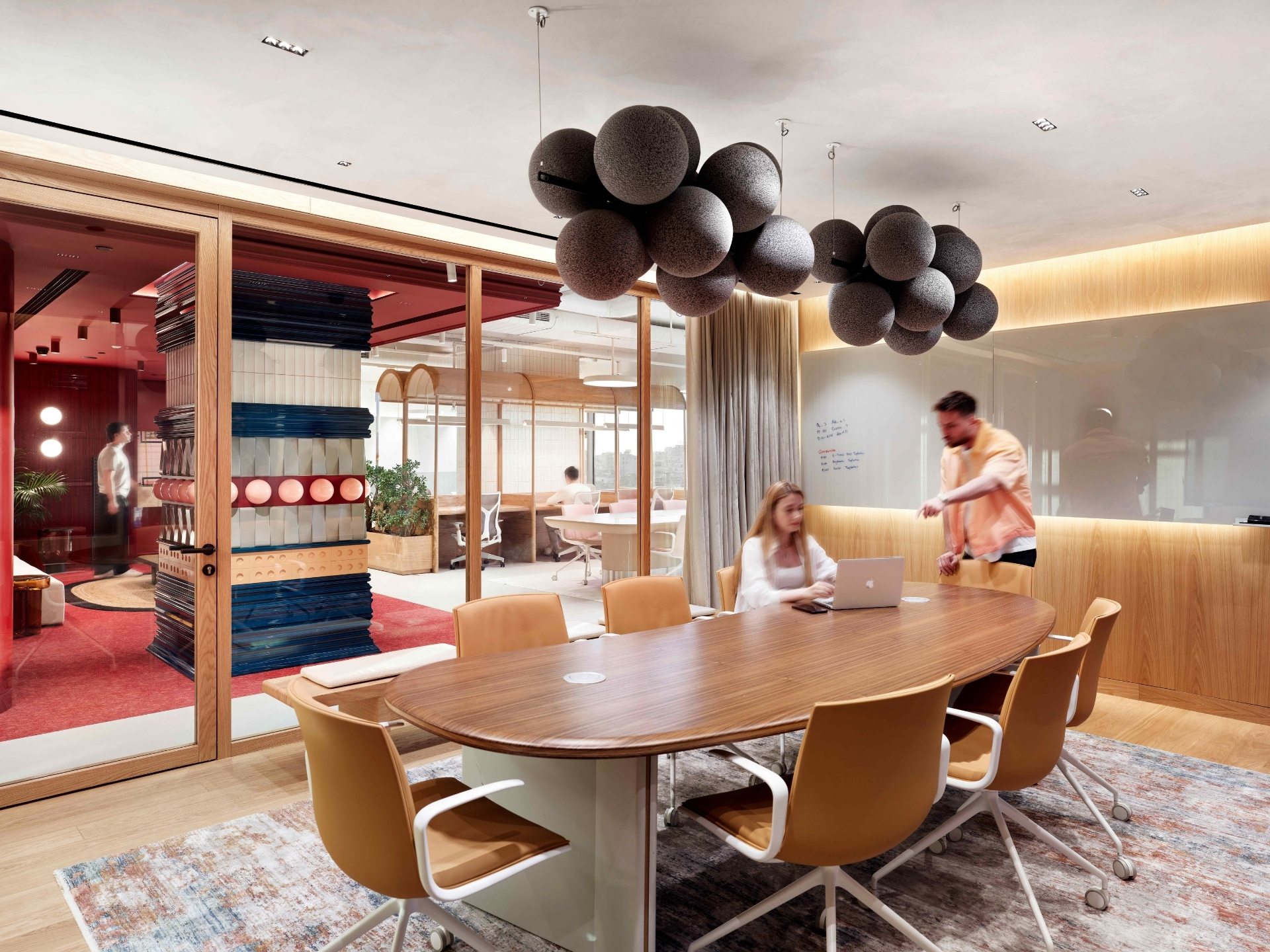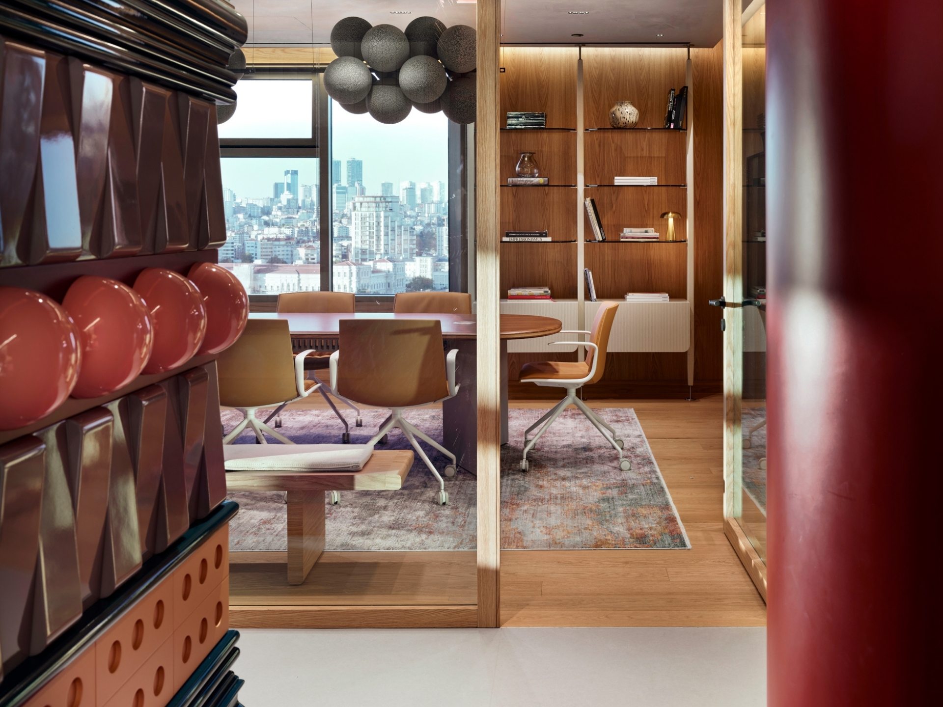 Toplantı Odaları: Mimari tasarıma sadık kalınarak, projeye özel ölçü ve detaylarda üretilen ahşap toplantı masaları ve duvar kaplamaları.