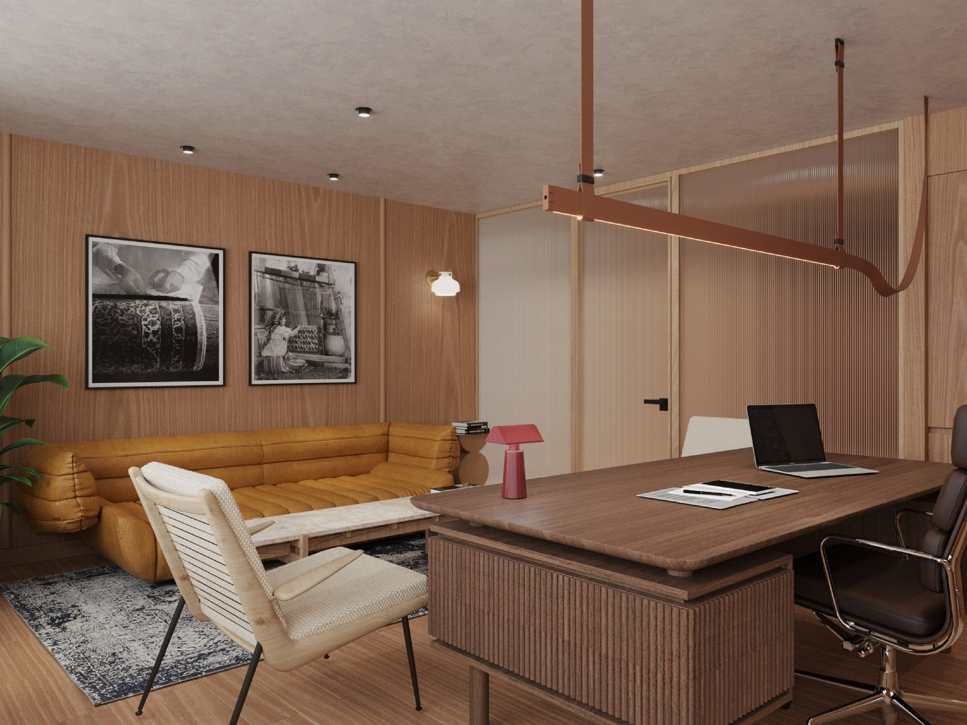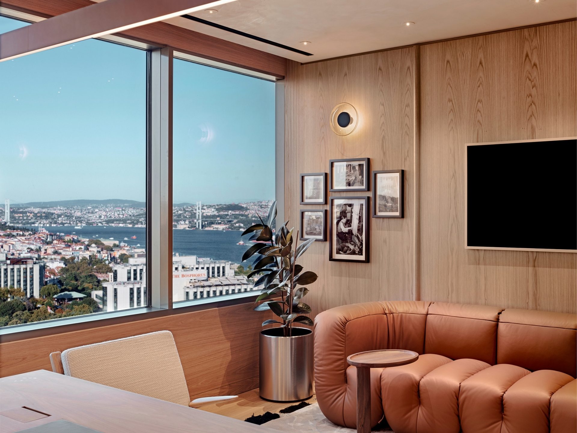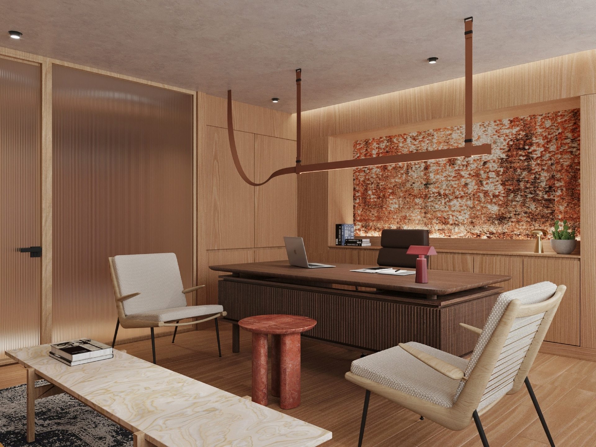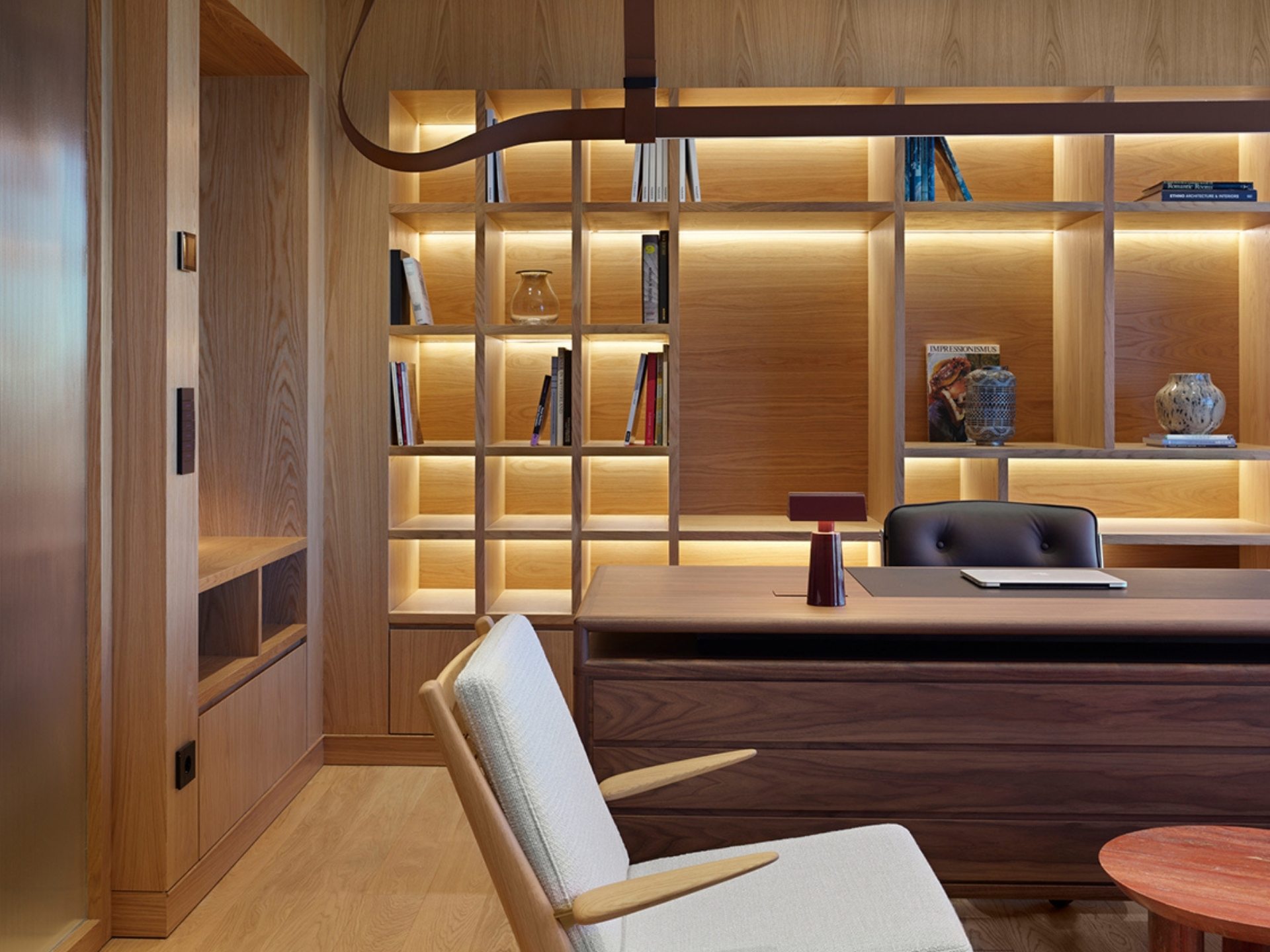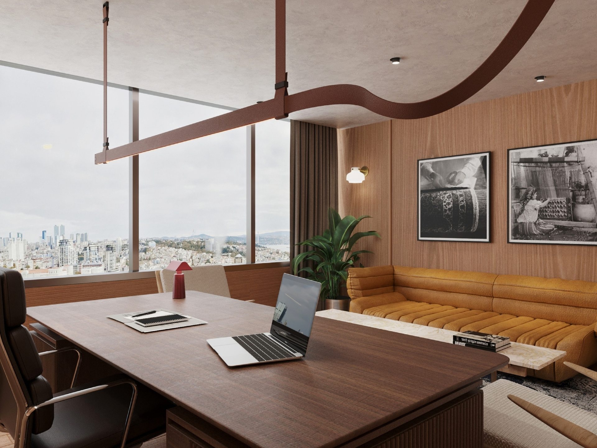 Yönetici Odaları: Prestijin ön planda olduğu makam odalarında; zeminden tavana özel tasarım kütüphane sistemleri, doğal kaplama duvar panelleri ve özel imalat ahşap çalışma masaları.