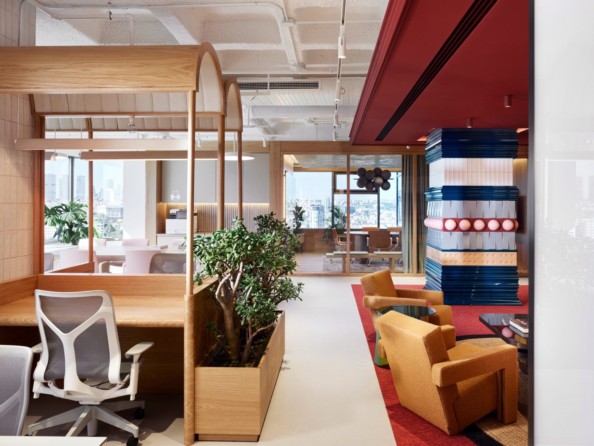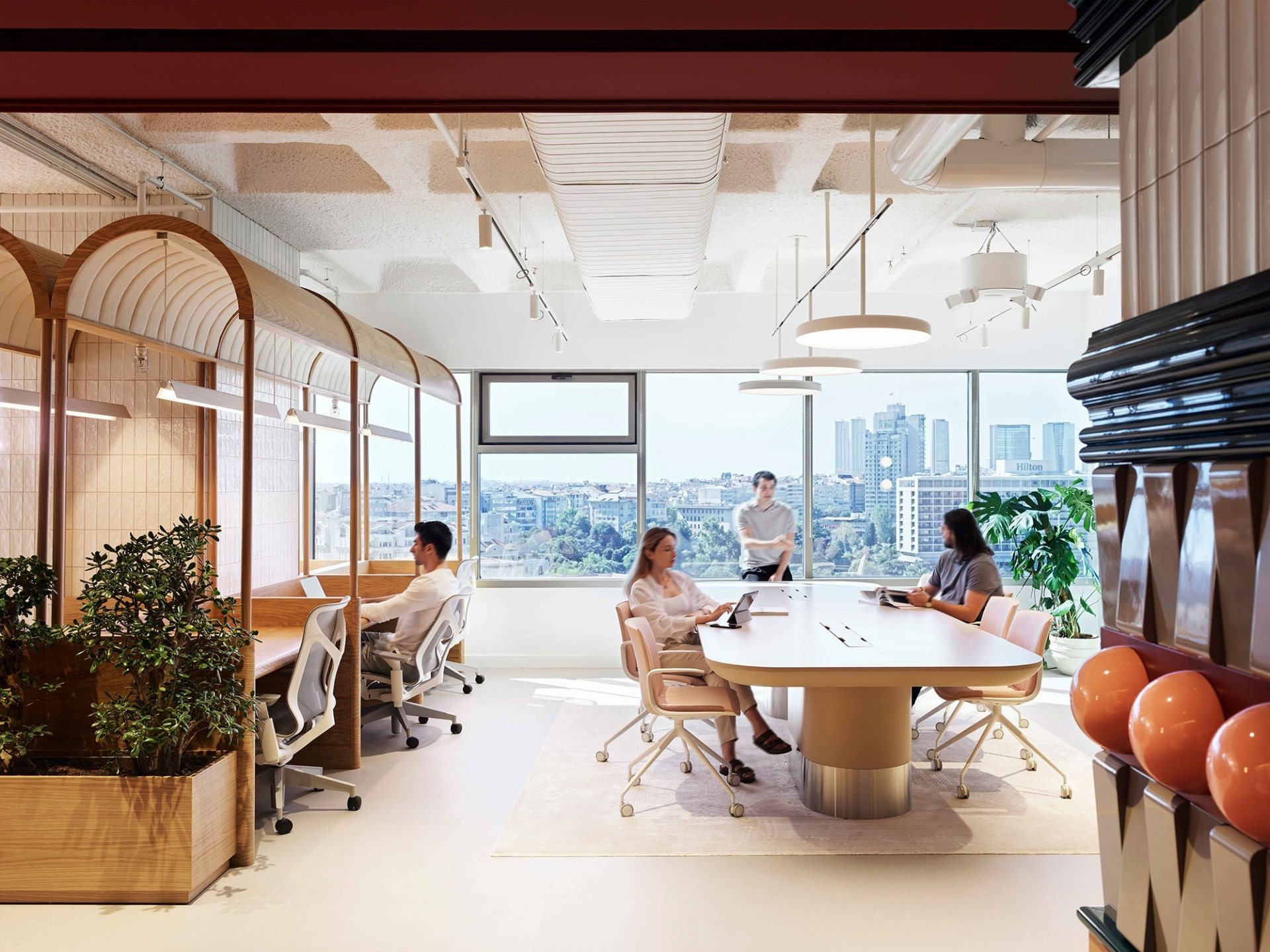 Ortak Çalışma Alanları: Açık ofis içinde özelleştirilmiş alanlar yaratan, ince ahşap işçiliği ile üretilmiş çatı formlu çalışma locaları, entegre saksı üniteleri ve çalışma bankları.