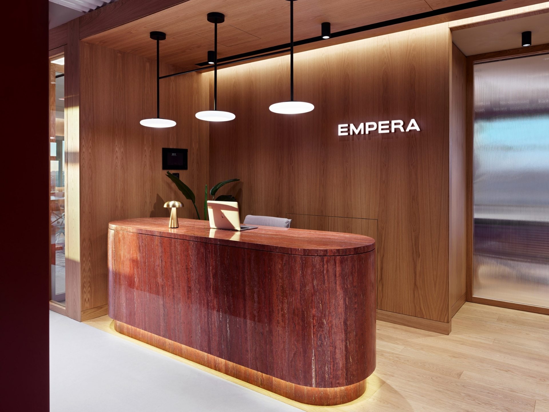 Empera Ofis Binası’nın nitelikli iç mimari projesinde; mekânın karakterini belirleyen tüm ahşap duvar kaplamaları, tavan detayları ve sabit mobilya grupları firmamız tarafından üretilip uygulanmıştır. Proje genelinde doğal ahşap dokusu, mekanlara göre özelleştirilmiş imalatlarla ön plana çıkarılmıştır.