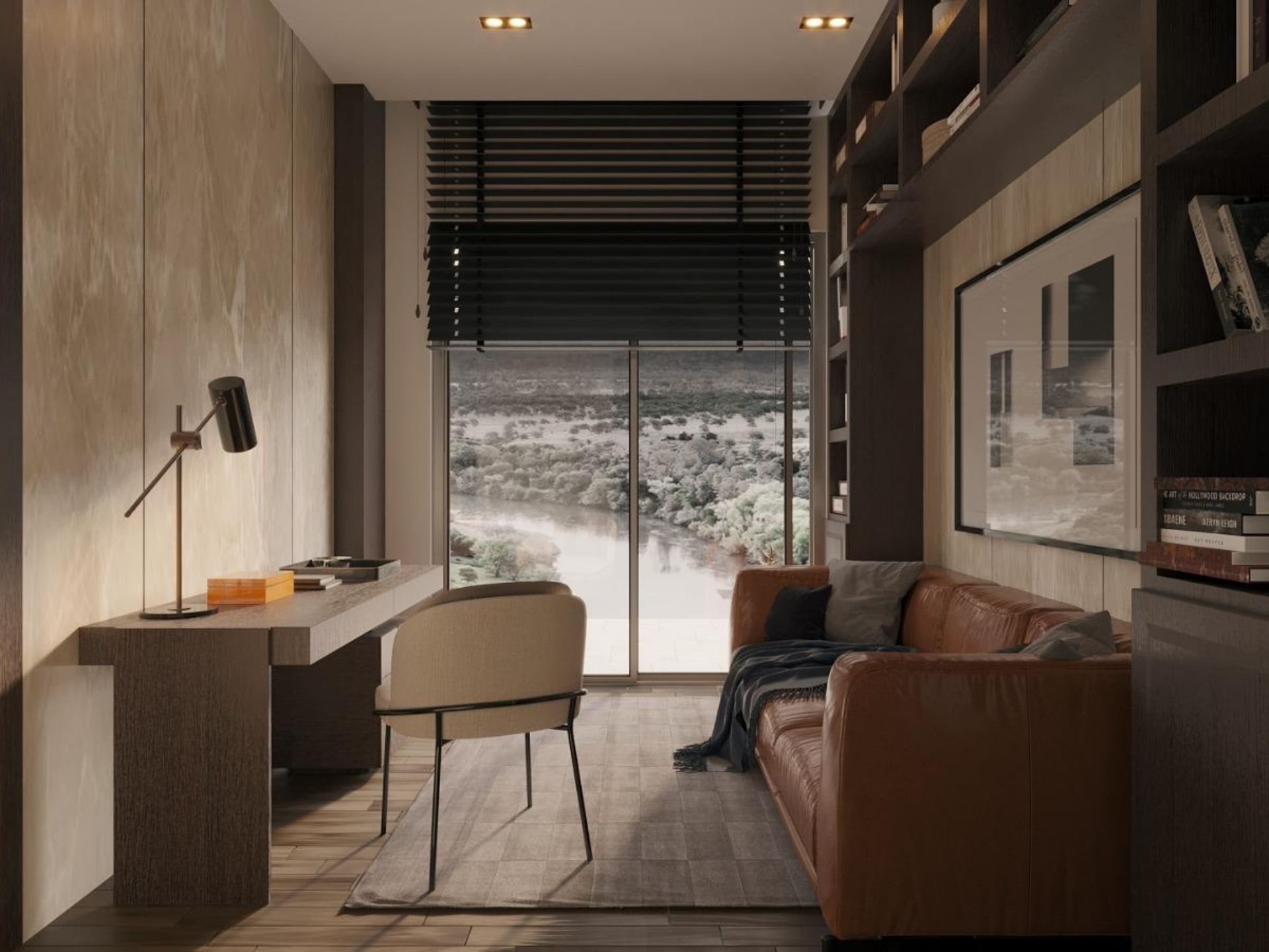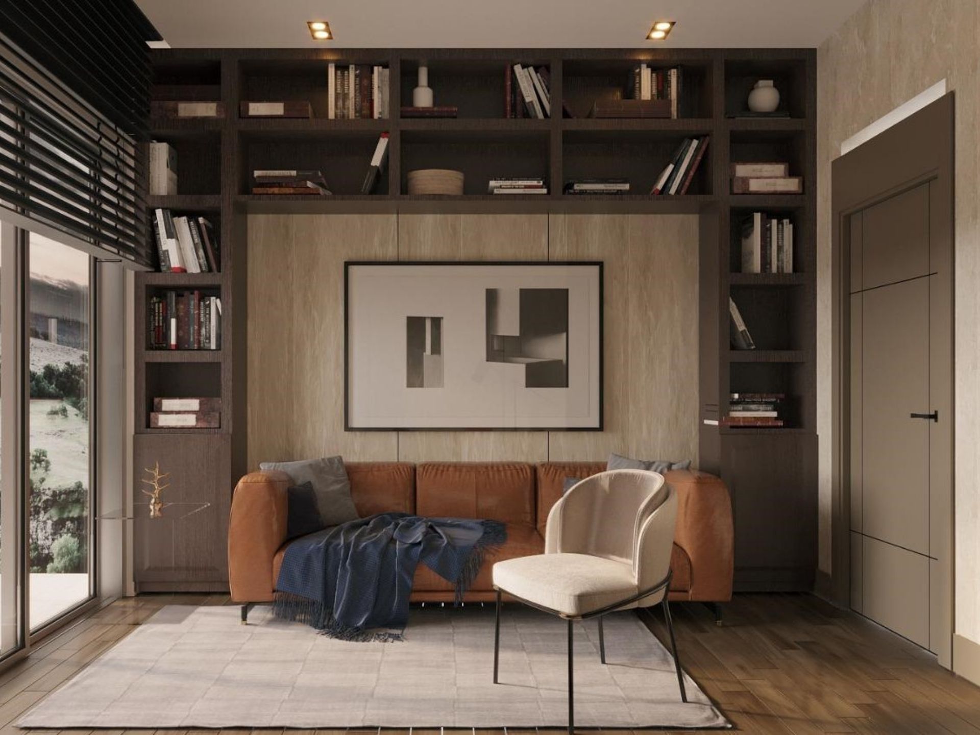 • Salon ve Çalışma Alanı: Mekâna derinlik katan koyu renk ahşap kaplamalı, zeminden tavana kadar uzanan özel tasarım kütüphane ünitesi ve TV duvarı entegrasyonu.