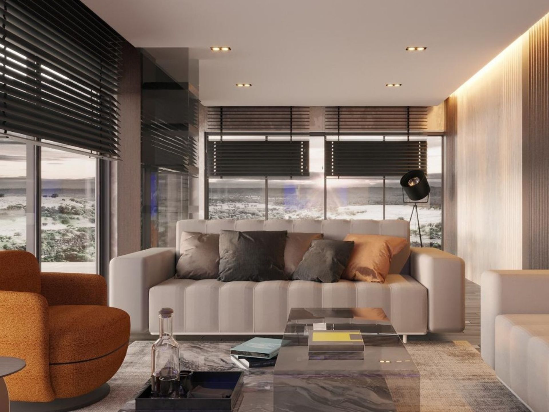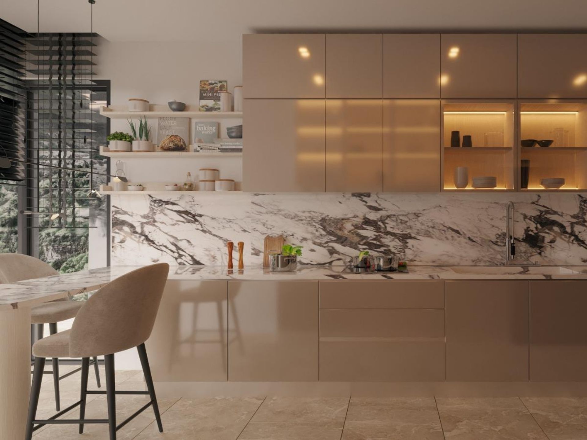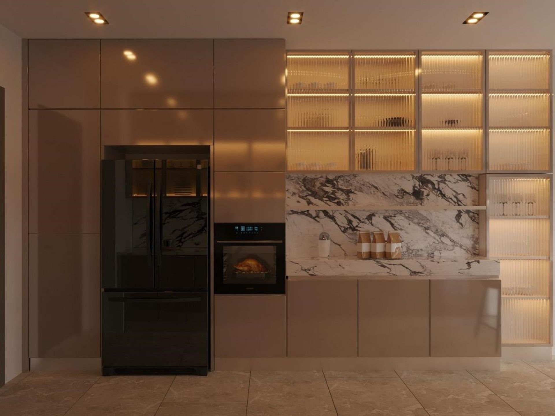 • Mutfak: Parlak lake yüzeyler ile bronz camlı üst dolapların kombinasyonu. Tezgâh arası mermer dokusuna uyumlu, kulpsuz ve modern kapak detayları.