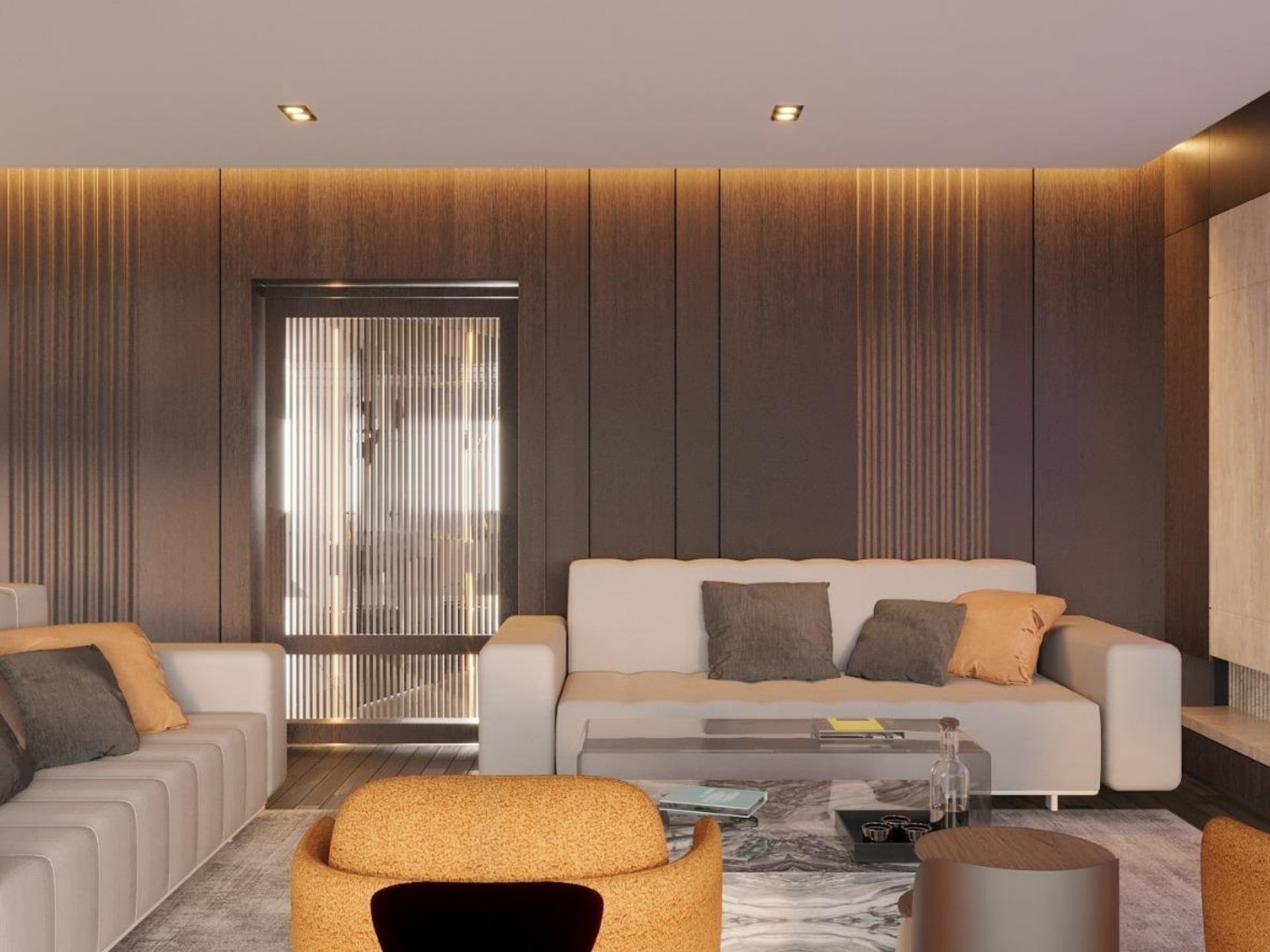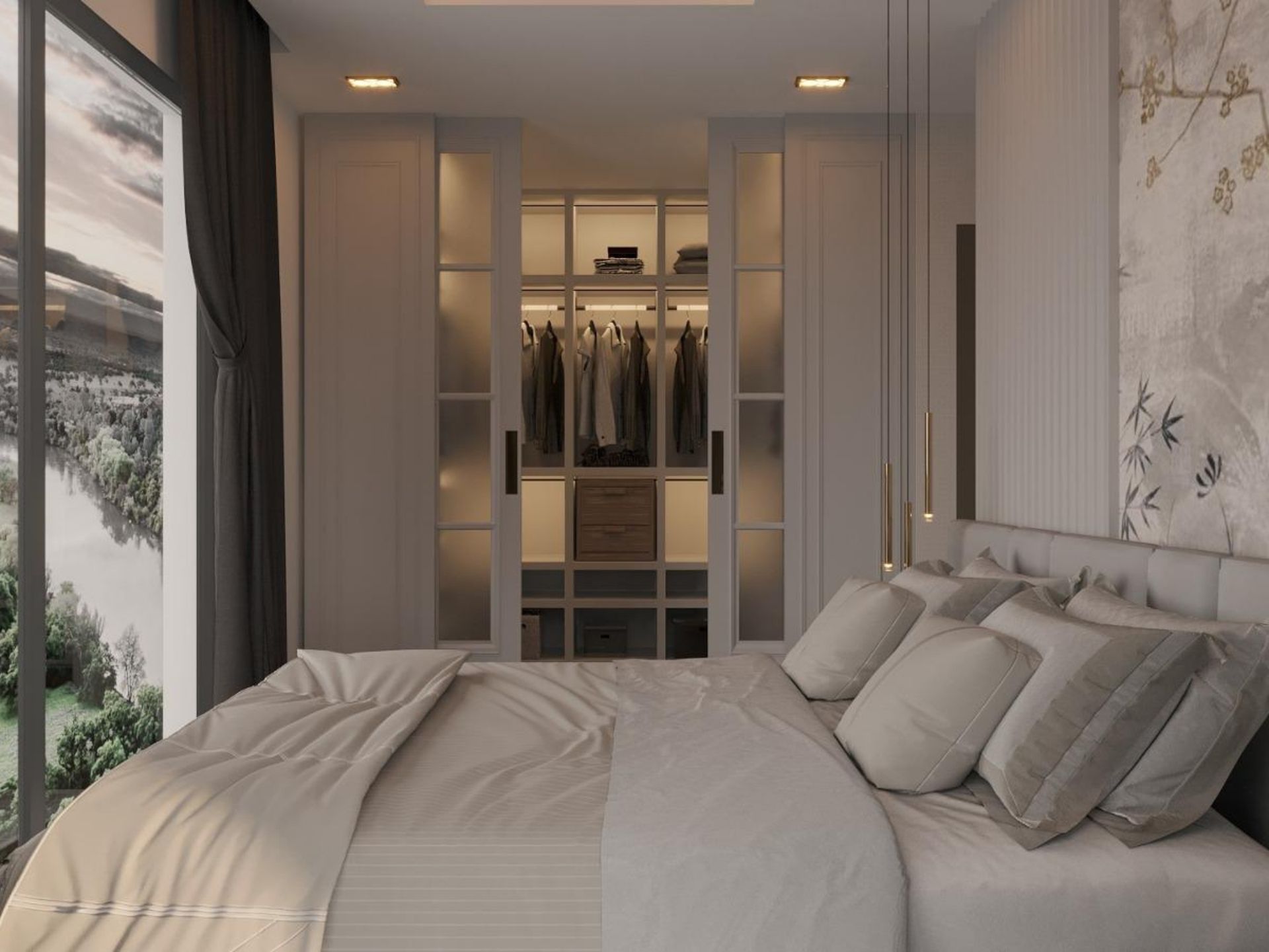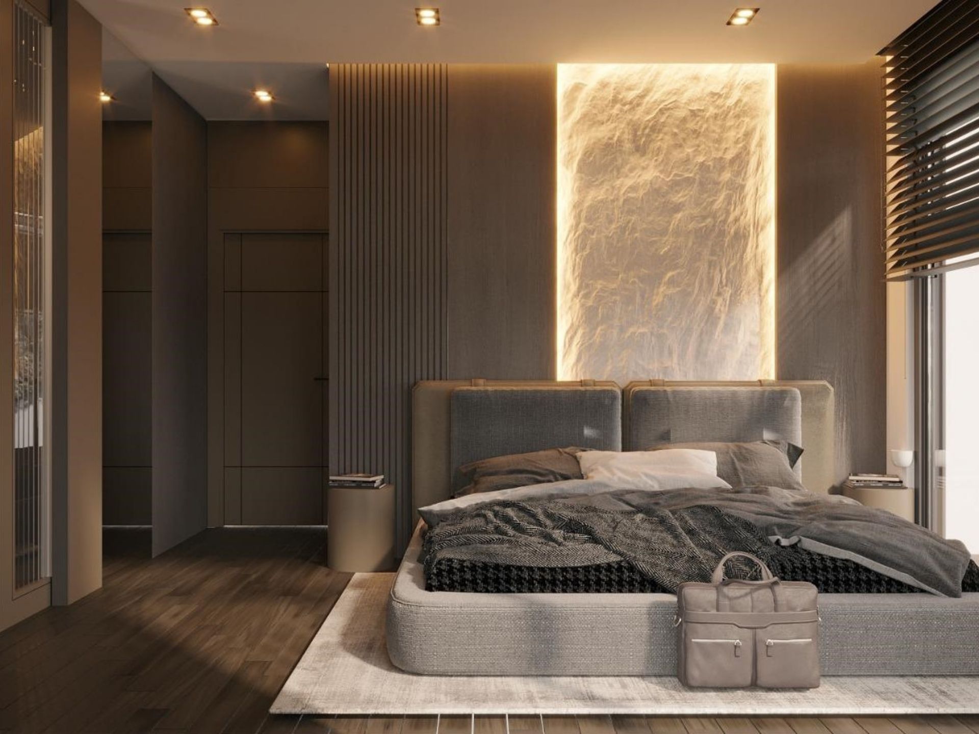• Yatak Odası: Yatak başı duvarında uygulanan dikey yivli lake paneller ve mekâna özel ölçülerde üretilen, şeffaf cam kapaklı ve içten aydınlatmalı giyinme dolapları.