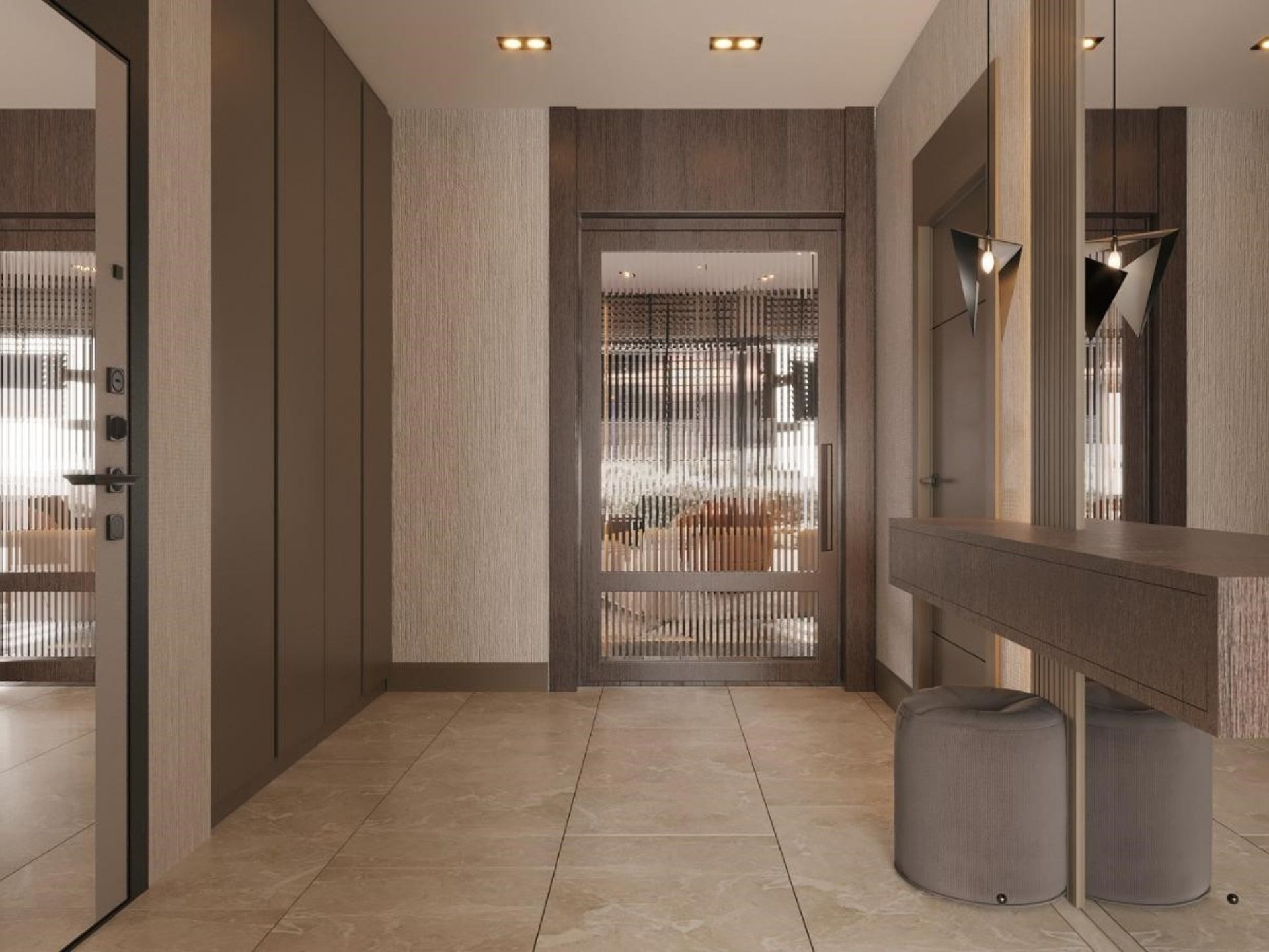 • Antre ve Hol: Kapı pervazları ile bütünleşik tasarlanan ahşap geçiş detayları, duvar kâğıdı ile uyumlu ahşap paneller ve özel üretim asma dresuar imalatı.